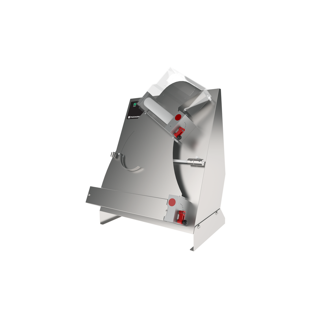 Formadora de pizzas para diámetros de 260 a 420mm, con dos rodillos de resina alimentaria. Esta fabricada en acero inoxidable, su potencia es: 370W. Cuenta con pedal de accionamiento.