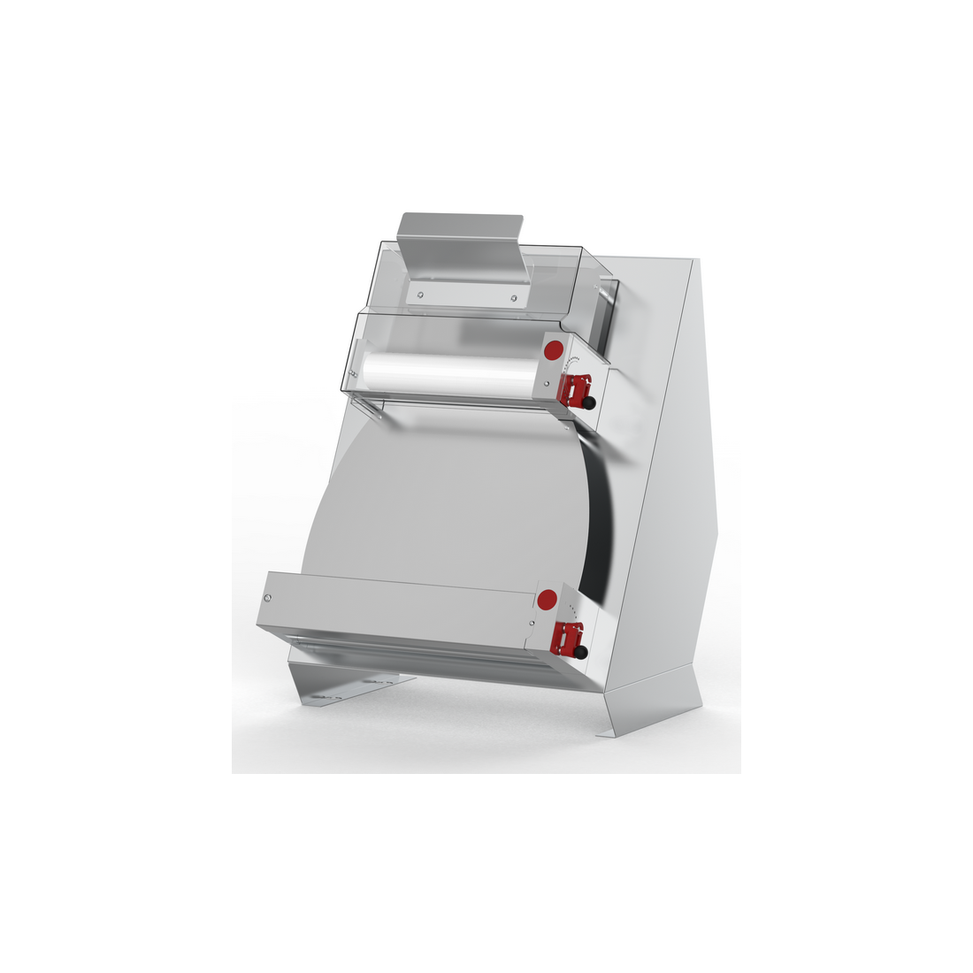 Formadora de masas de pizza para diámetros de 260 a 400mm, con dos rodillos de resina alimentaria. Está fabricada en acero inoxidable, su potencia es: 370W. Modelo de Fabricación Italiana. Rodillos alineados. Pedal incluido.