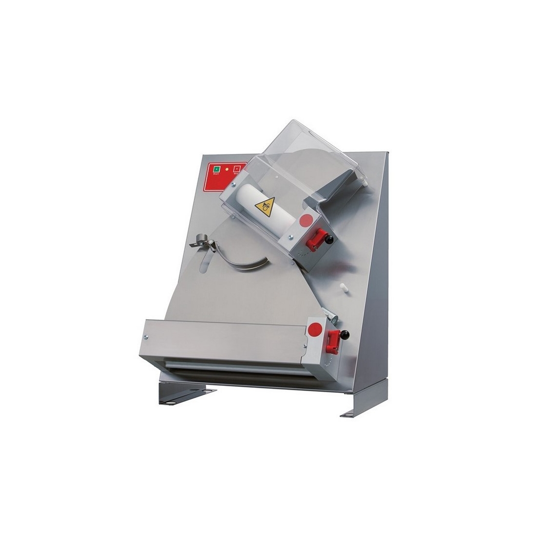 Laminadora de pizzas para diámetros de 260 a 400mm, con dos rodillos de resina alimentaria. Está fabricada en acero inoxidable, su potencia es: 500W. Modelo de Fabricación Italiana.