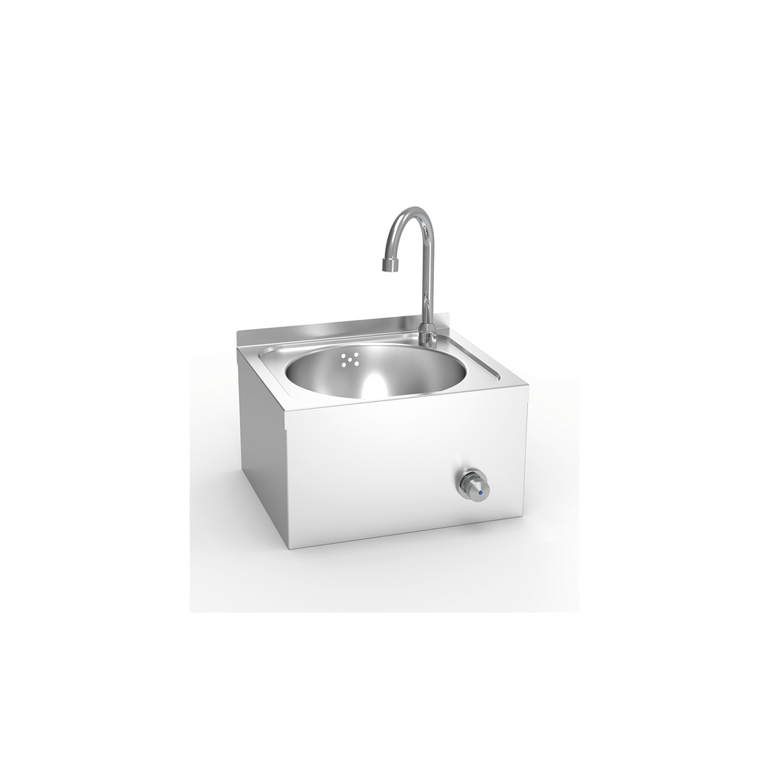 Lavamanos mural de pulsador con medidas reducidas. Cuenta con grifo giratorio y Agua fria /caliente. Medidas: 350 x 300 x 210mm