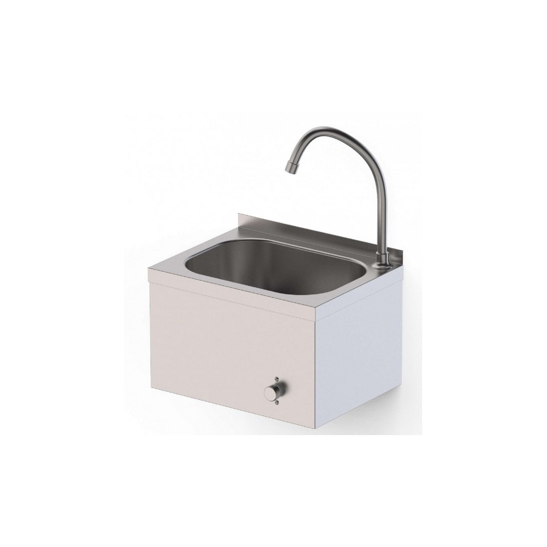 Lavamanos mural de sobremesa construido en acero inoxidable de alta calidad AISI-304. Tiene la cuba embutida y unas medidas de 400 x 300 x 300 mm. Equipado con pulsador automezclador agua fría/caliente y grifo giratorio. Ideal para espacios reducidos.