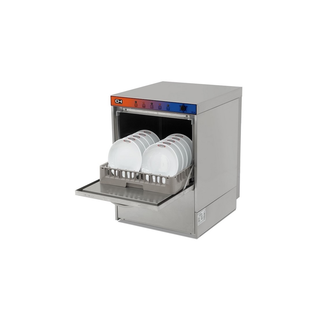 Lavavajillas industrial CH500ECO de Clima Hostelería, con cesta de 50x50cm y altura de 32cm. Estos lavavajillas están construidos en acero inoxidable de alta calidad. Cuenta con un programa de lavado de 120 segundos, dosificador de abrillantado de serie. Además, cuenta con brazos giratorios superiores e inferiores de lavado y aclarado.