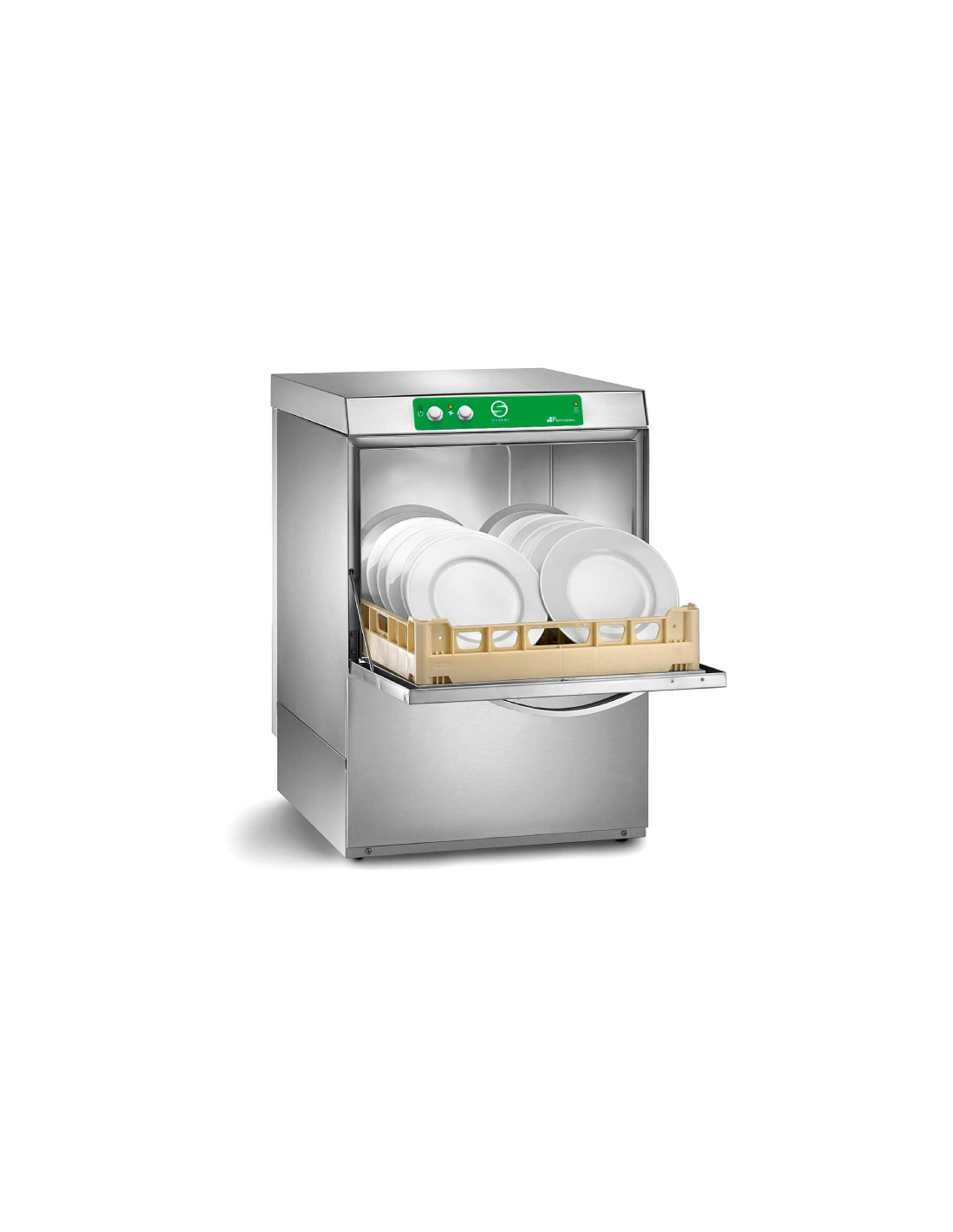 Lavavajillas profesional con cesta de 500 × 500 mm, consumo de agua de solo 2,6 L por ciclo y ciclo de 150 s. Potencia total de 3,9 kW, resistencias independientes y bomba de 0,4 kW. Carcasa de acero inoxidable con doble filtrado y bajo nivel de ruido. Medidas: 565 × 610 × 825 mm. Tensión: 230 V.