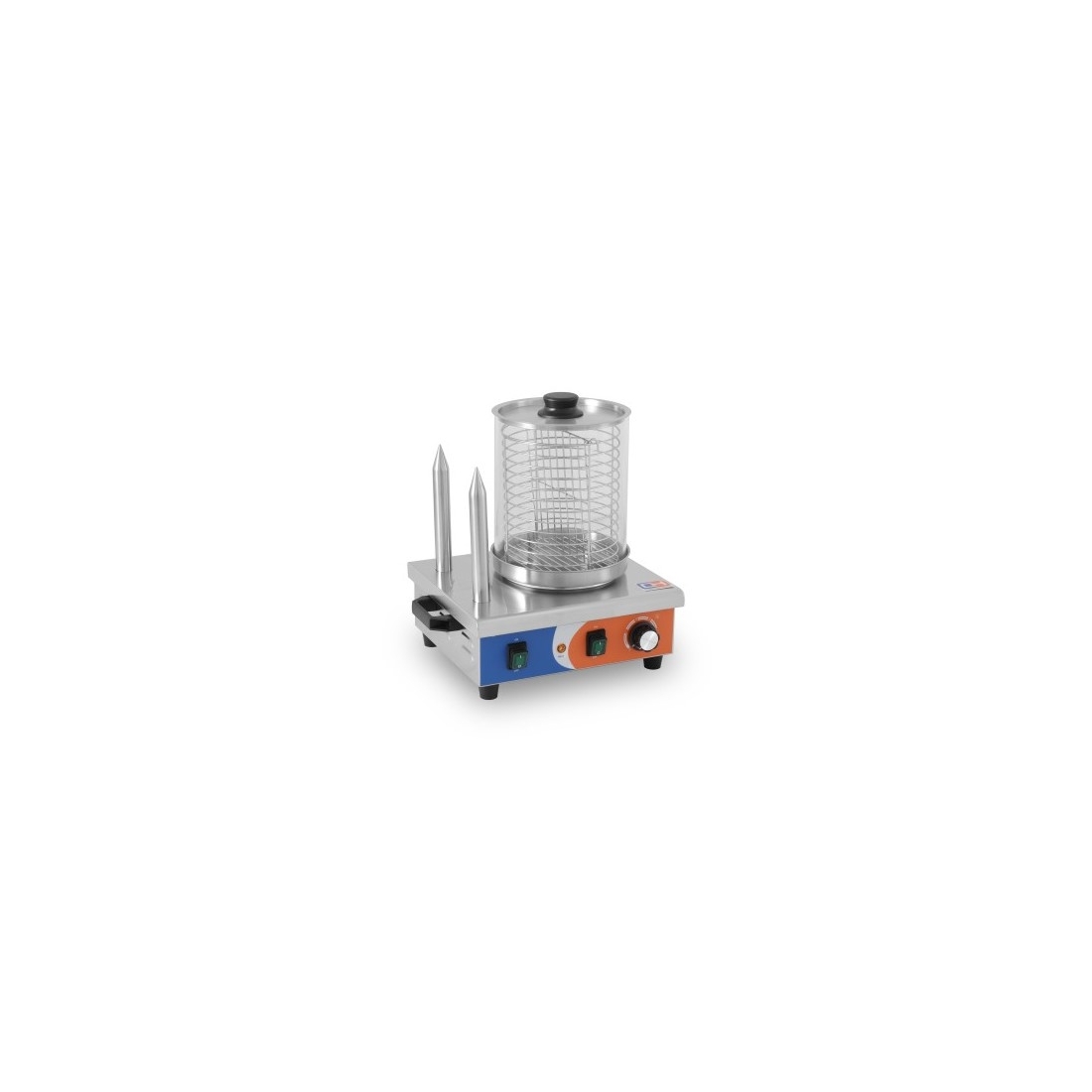 Maquina de hacer perritos calientes, con 2 pinchos. Cilindro de cristal para escaldar salchichas de 220 x 260 mm. Barras de acero inoxidable. Rango temperatura +40ºC/+100ºC. Medidas: 410 x 340 x 370 mm.