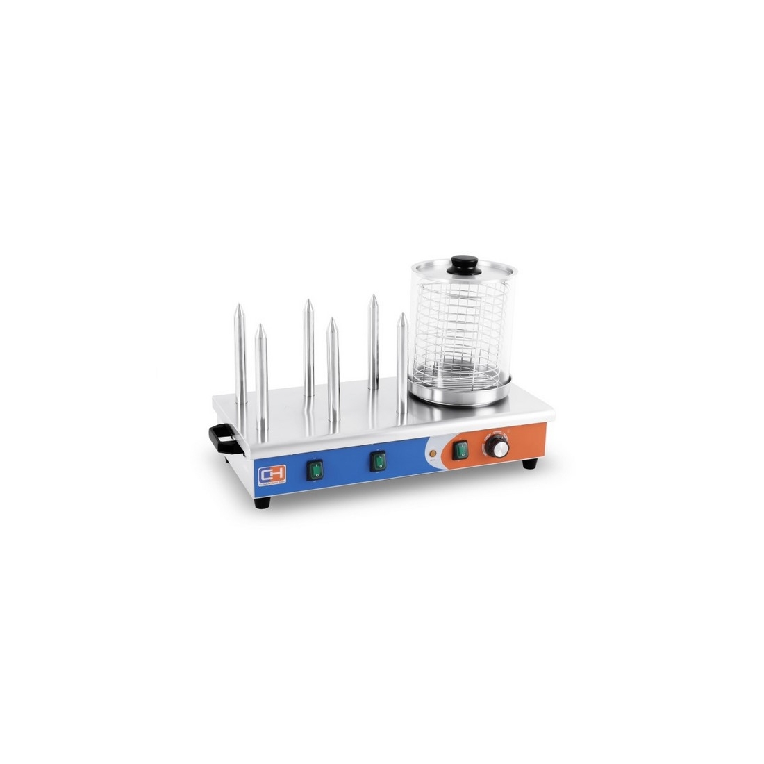 Maquina de hacer perritos calientes, con 6 pinchos. Cilindro de cristal para escaldar salchichas de 220 x 260 mm. Barras de acero inoxidable. Rango temperatura +40ºC/+100ºC. Medidas: 670 x 340 x 370 mm.