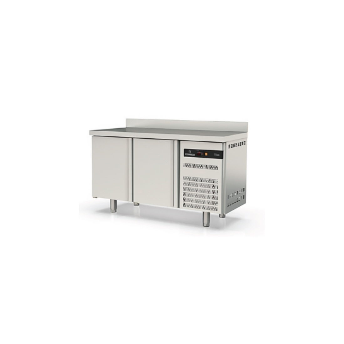 Mesa mantenimiento congelados de 2 puertas. Cuenta con control digital y puertas reversibles de cierre automático. Gestión óptima de energía y sistema de enfriamiento forzado. Incluye 2 estantes ajustables. Medidas: 1495 x 600 x 850 mm.