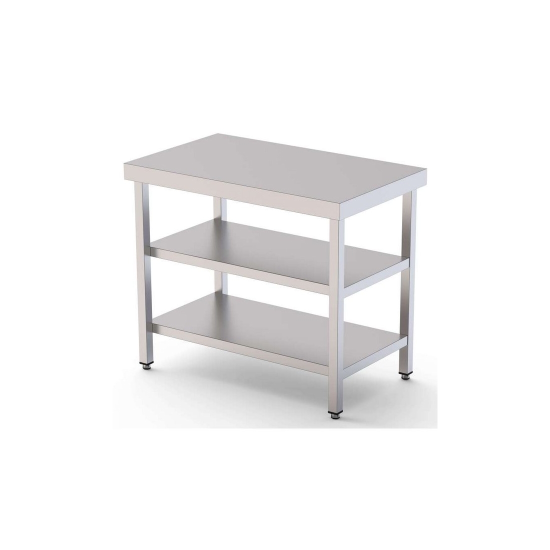 Mesa de trabajo central construida en acero inoxidable de alta calidad AISI304. Encimera de acero inoxidable AISI304 satinado. Disponible arriostrada, con un estante y con dos estantes. También realizamos modelos de mesas a medida, consúltenos. Según disponibilidad entrega de 7 a 10 días hábiles.