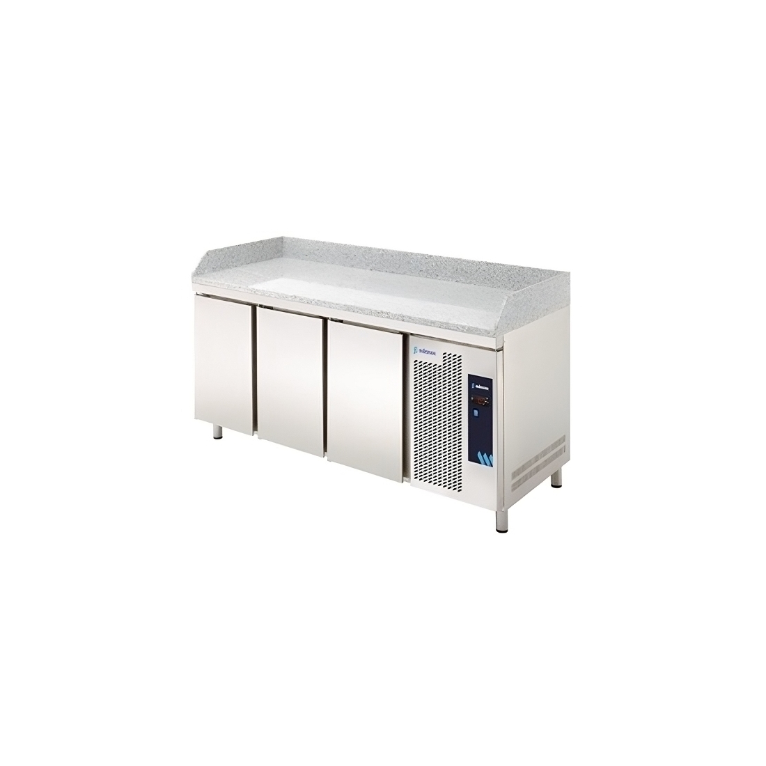 Mesa fría especial para pizzas con encimera de granito. Cuenta con tres puertas, 455 litros de capacidad y una clasificación energética C. Incluye un diseño robusto y de fácil mantenimiento. Además, destaca por su consumo anual de solo 1119 Kw/año. Apta para trabajar en entornos de hasta 38ºC. Dimensiones: 1792 x 700 x 1050 mm.