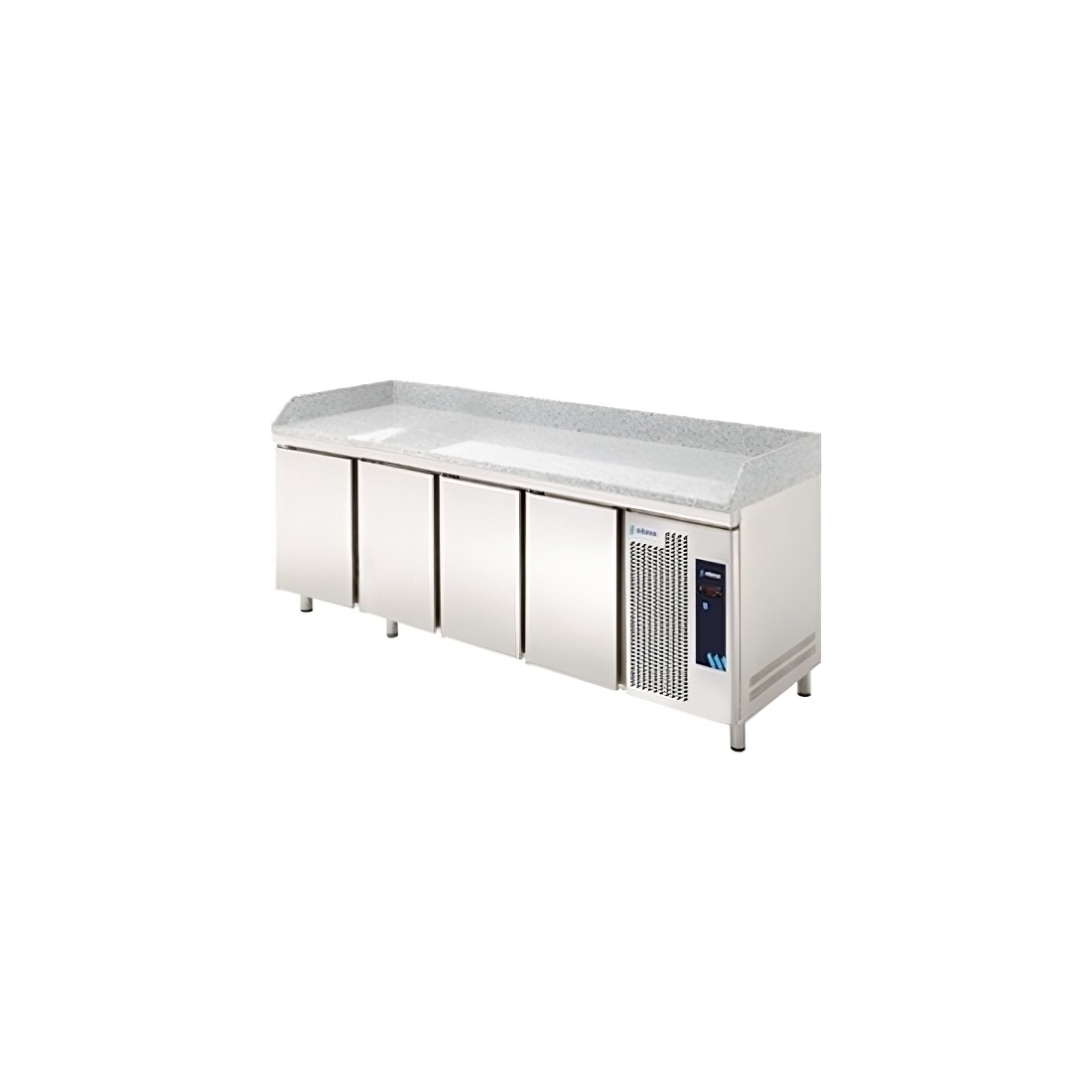 Mesa fría especial para pizzas con encimera de granito. Cuenta con cuatro puertas, 615 litros de capacidad y una clasificación energética E. Incluye un diseño robusto y de fácil mantenimiento. Además, destaca por su consumo anual de solo 1920 Kw/año. Apta para trabajar en entornos de hasta 38ºC. Dimensiones: 2242 x 700 x 1050 mm.