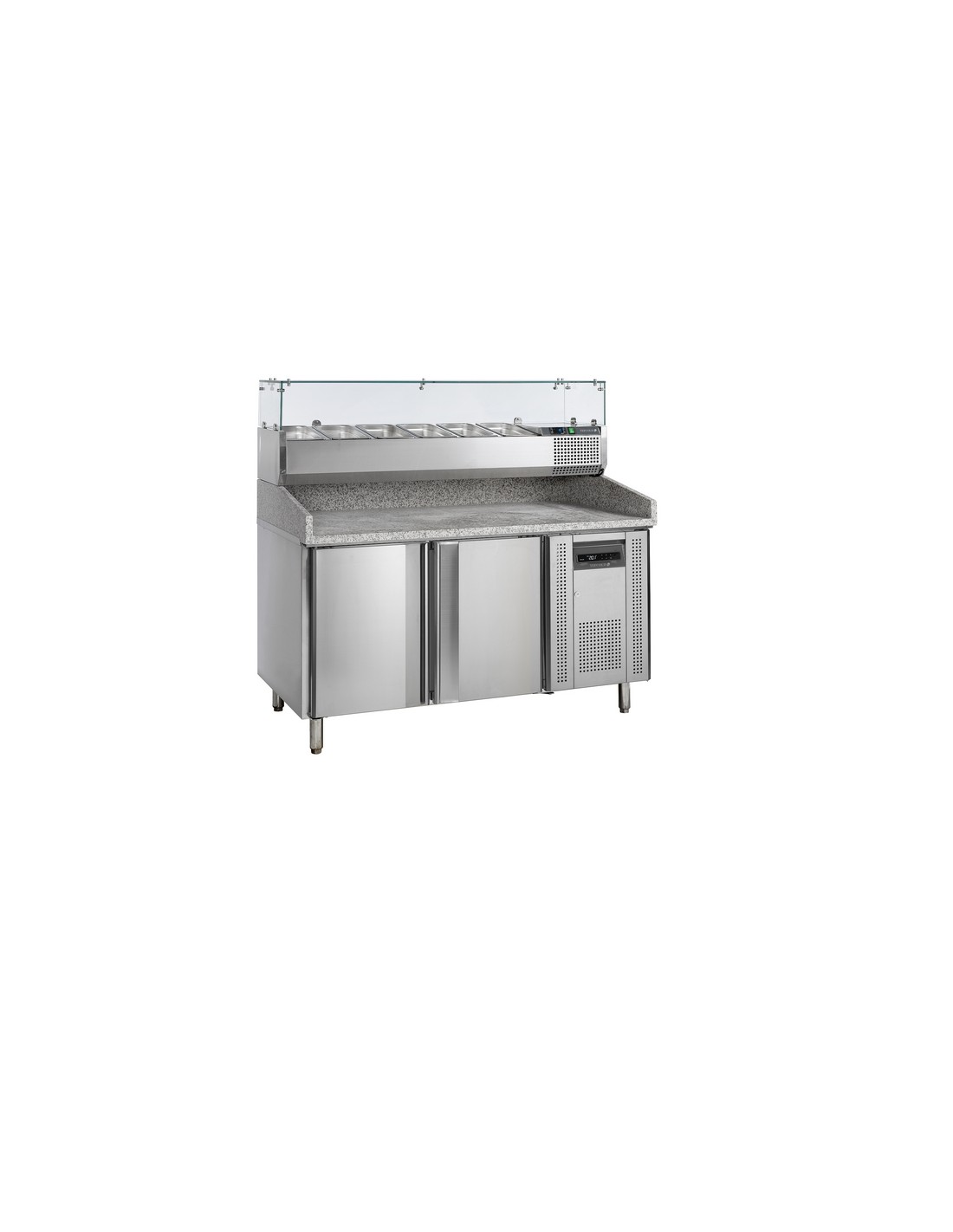 Mesa refrigerada para pizzas 2 puertas, con encimera de granito, capacidad para 14 bandejas 400x600 mm y 6 bandejas GN 1/3. Puertas de cierre automático, refrigeración forzada y control electrónico. Medidas exteriores: 1510 x 800 x 1448 mm. Rango de temperatura: +2/+10 ºC. Clase energética B.