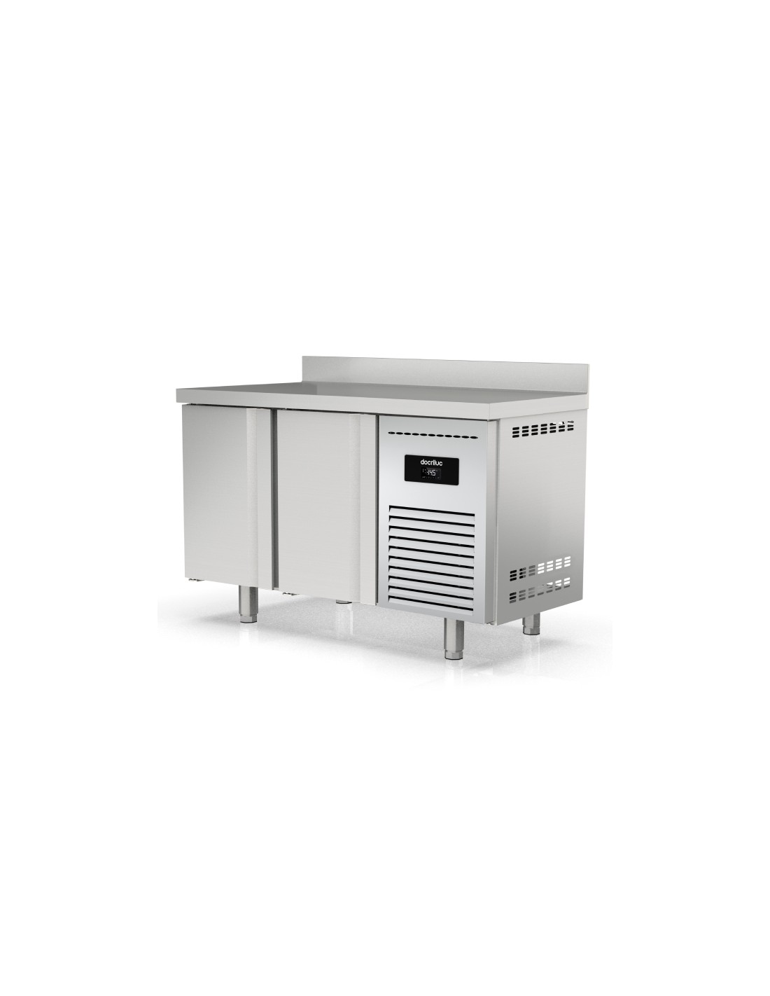 Bajo Mostrador 2 Puertas MD-150 Docriluc, es un equipo robusto en acero inox, con cierre de puertas automático. Los estantes son ajustables, y las patas regulables en altura. Incluye unidad condensadora ventilada y evaporador ventilado anticorrosión. Control digital para gestionar temperatura y desescarches, preparado para trabajar en entornos de hasta 40°C.