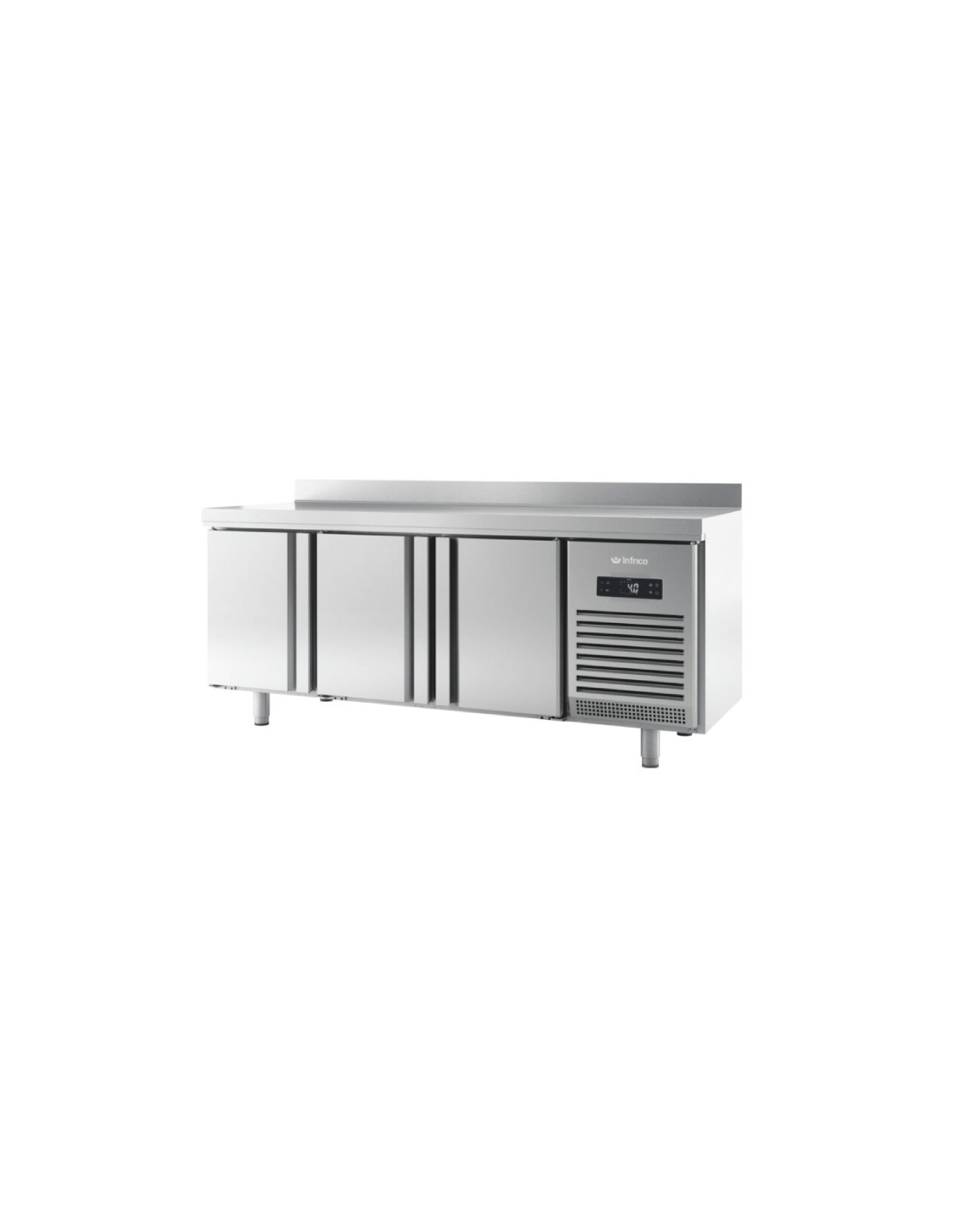 Mesa Refrigerada 3 Puertas Fondo 60 Infrico, diseñada para proporcionar capacidad de conservación y superficie de trabajo en un único equipo compacto. Fabricada en acero inoxidable AISI-304, integra un sistema de refrigeración monoblock ventilado de alta eficiencia con refrigerante R-290.