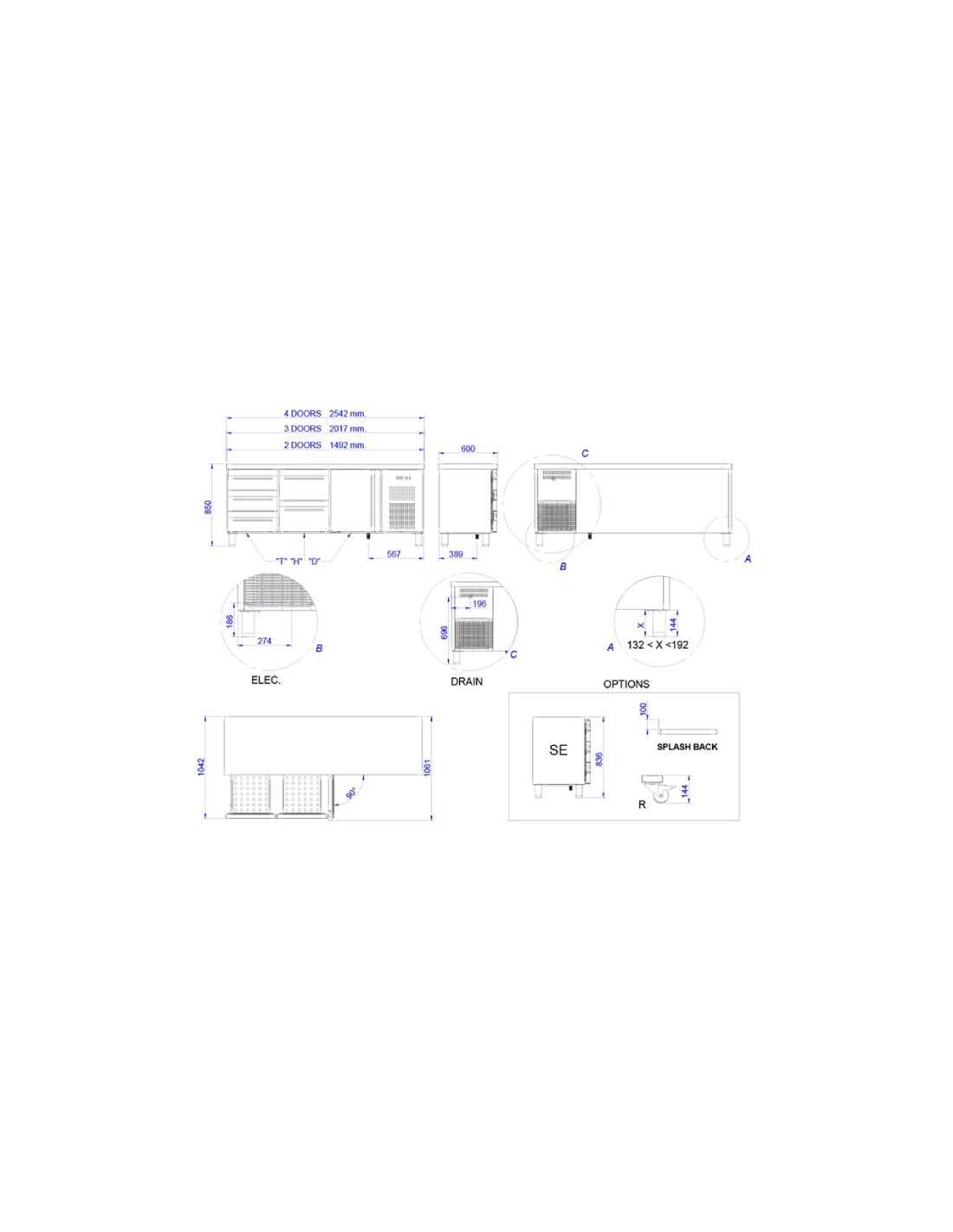 - Cuatro puertas de cristal con tirador frontal, retorno automático y fijación de apertura.