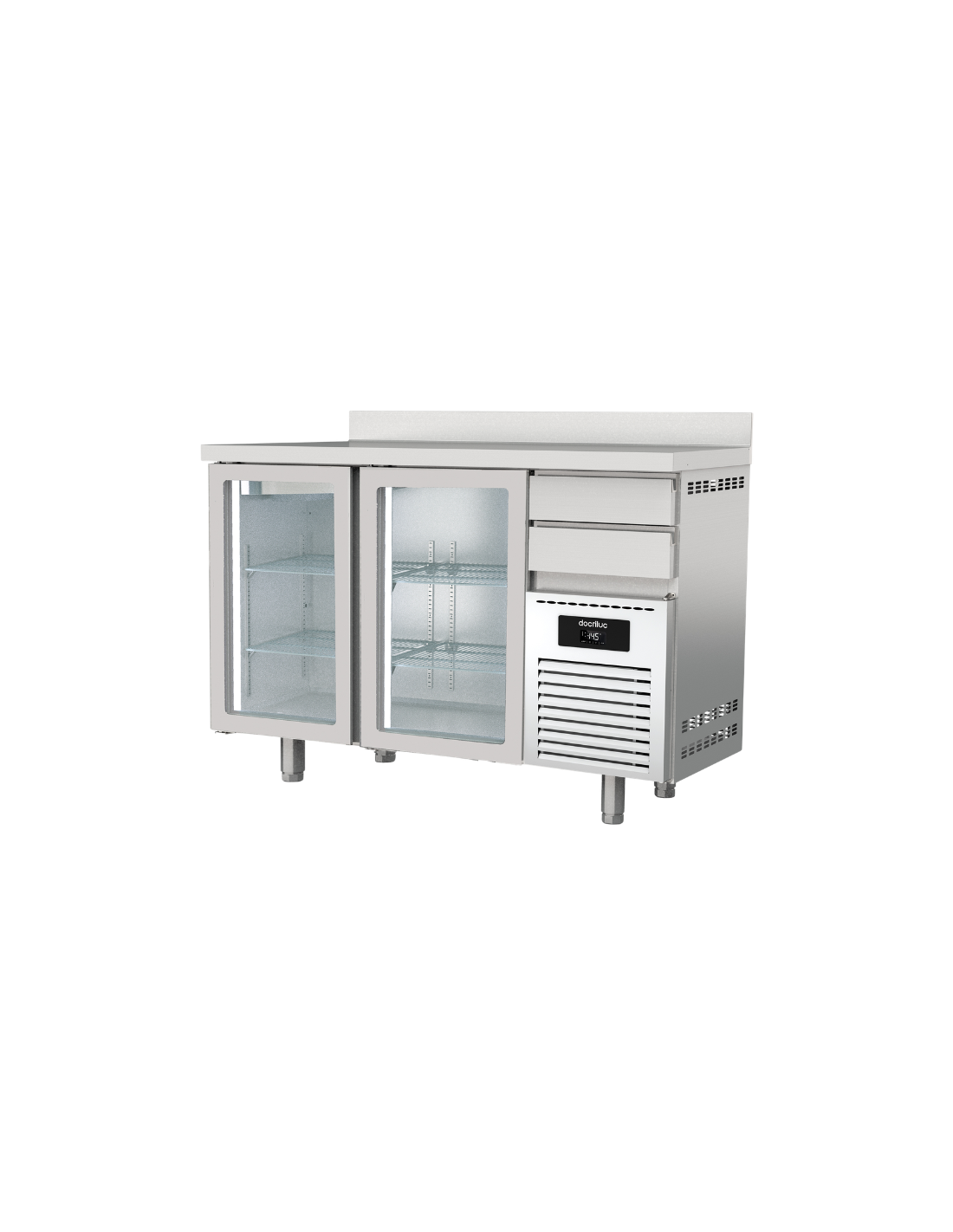 Mesa Refrigerada Bajo Barra 2 Puertas Cristal MFRV-150 Docriluc, mesa de trabajo profesional con almacenamiento refrigerado diseñada para bares, restaurantes y cocinas profesionales que necesitan mantener ingredientes o bebidas a temperatura controlada mientras se trabaja sobre la encimera.