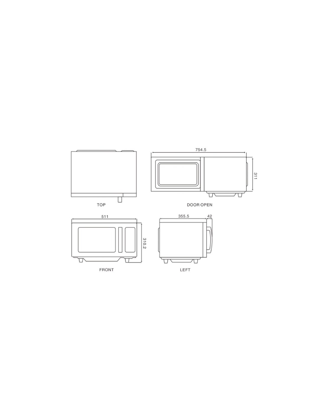 Microondas profesional de 25 L con potencia de salida 1000 W y base cerámica plana. Control soft-touch, 5 niveles, hasta 100 programas y función X2. Cámara inox 327×346×200 mm y medidas 515×431×311 mm. Tensión 230 V.