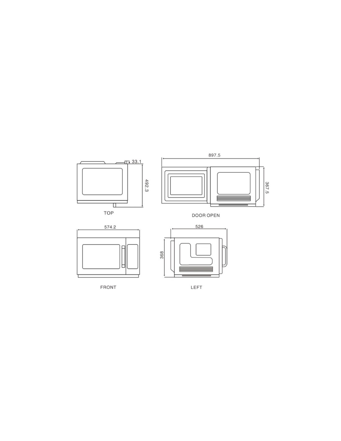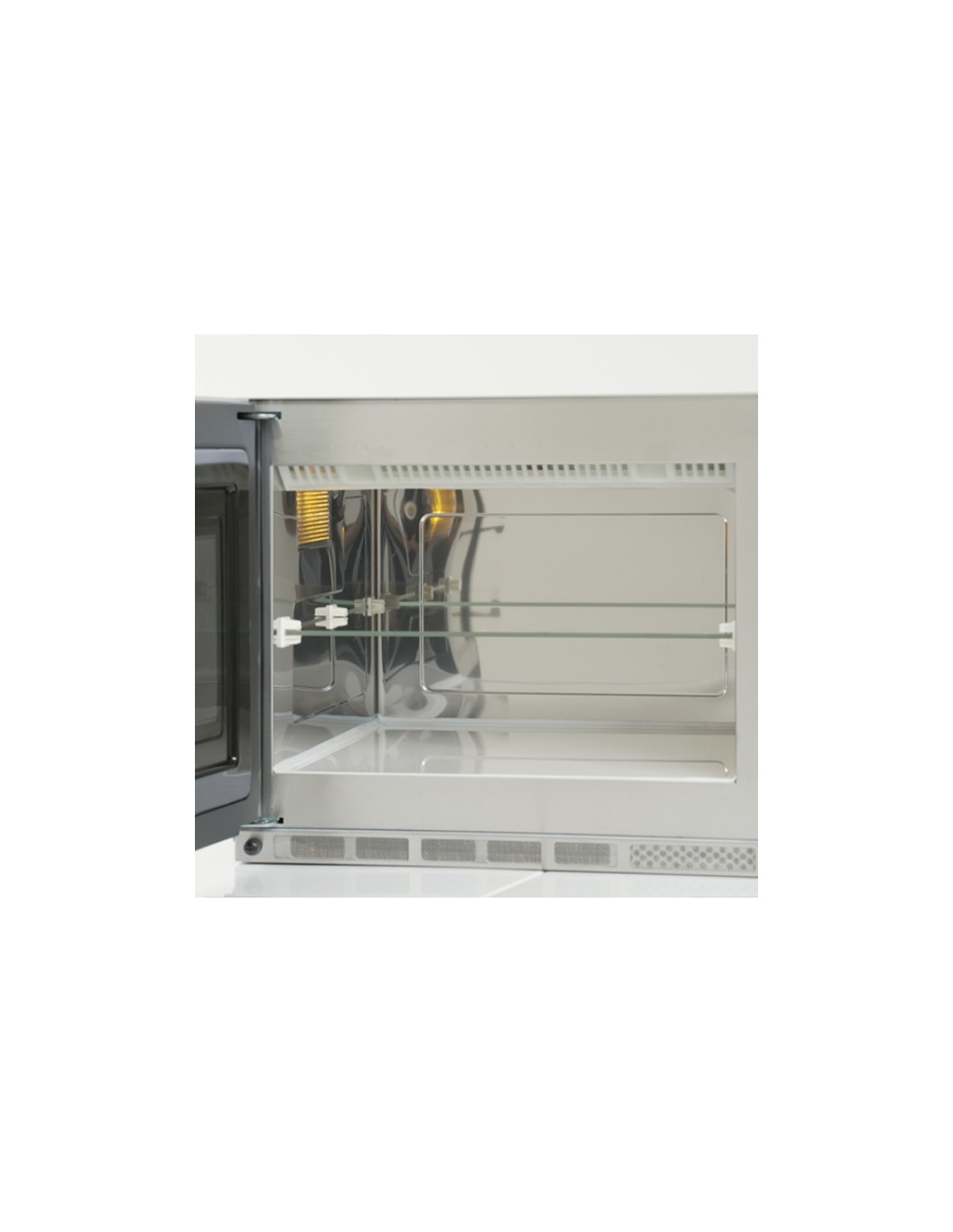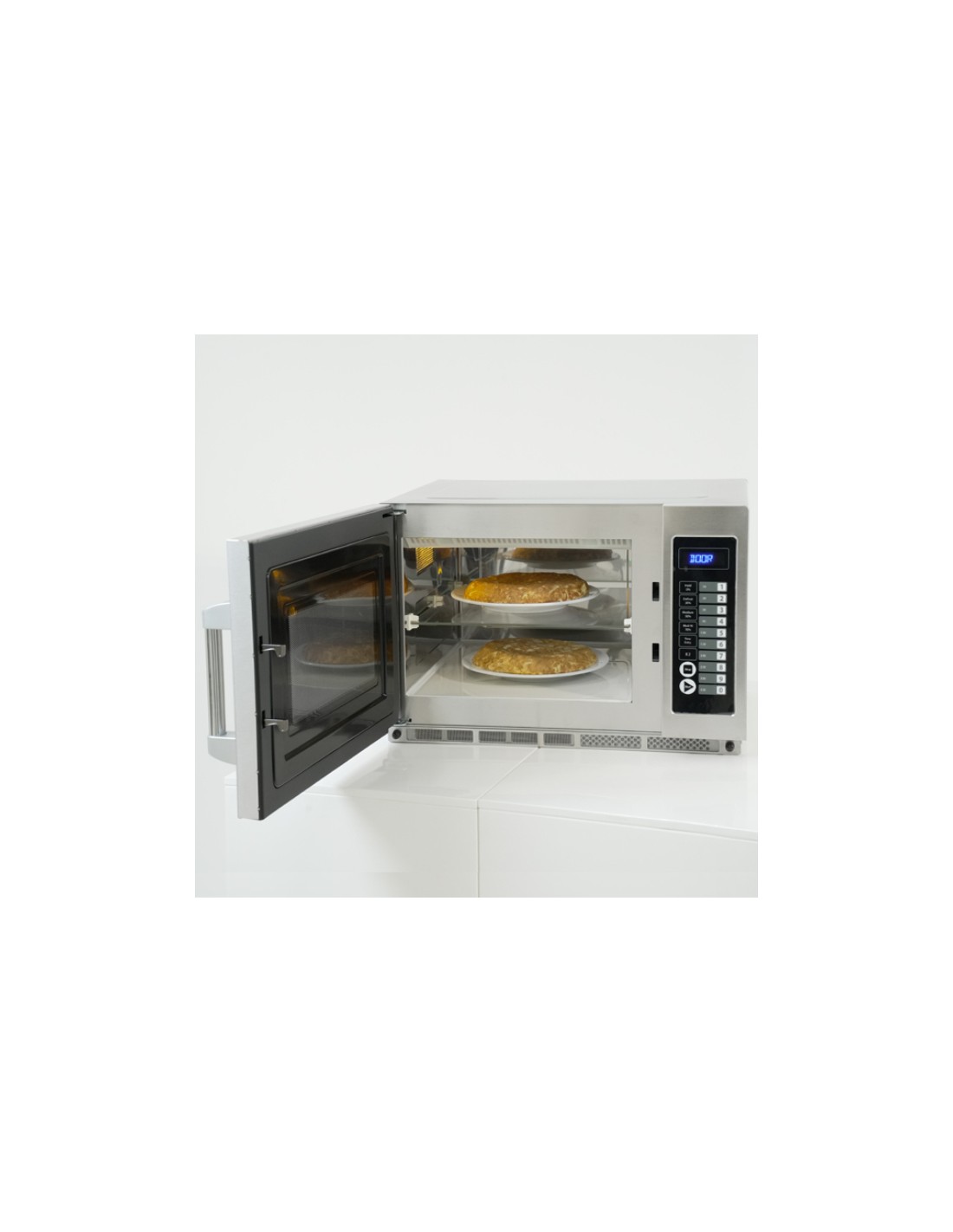 Microondas profesional de 34 L con doble magnetrón y potencia de salida 1800 W. Base cerámica plana, control soft-touch, 5 niveles, 100 programas, función X2 y estante intermedio extraíble. Cámara 360×409×225 mm. Medidas: 574×526×367 mm. Tensión 230 V.