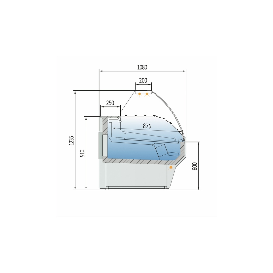Mostrador para carnicería de dimensiones 2945 x 1080 x 1235 mm, con una superficie de exposición de 850 mm y área de exhibición de 2,41 m². Equipado con una potencia frigorífica de 1284 vatios para un funcionamiento eficiente y de bajo consumo. Incorpora una capacidad de reserva de 896 litros y 4 puertas de acceso. Destaca por su diseño de cristal curvo.