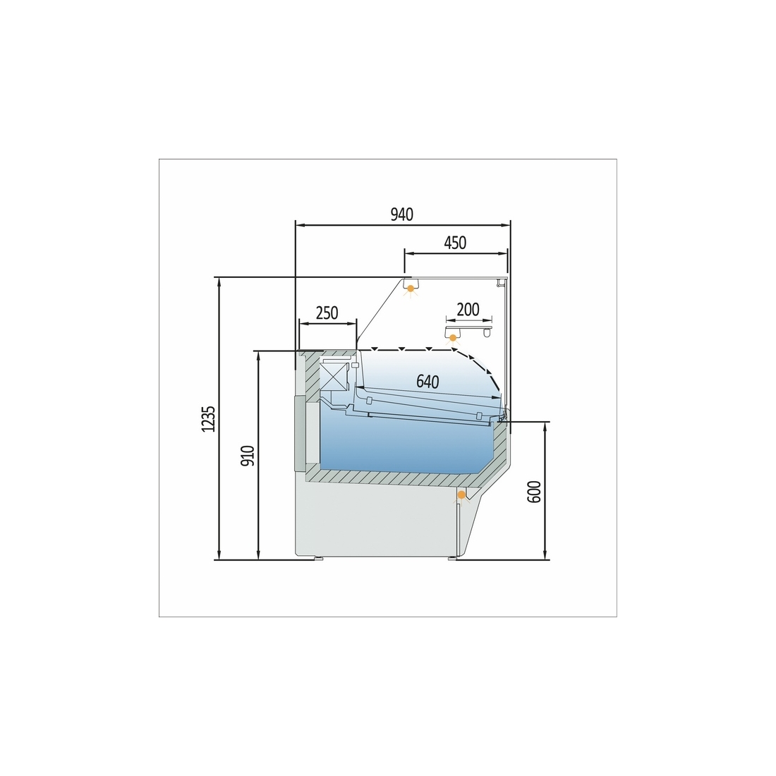 Vitrina de charcutería con unas dimensiones de 1265 x 940 x 1235 milímetros. Equipada con una superficie de exposición de 640 milímetros. Incluye 2 puertas traseras de reserva para el almacenamiento con una capacidad de 376 litros. Refrigeración de alto rendimiento, con consumo energético reducido. Diseñada con tipo de cristal recto.