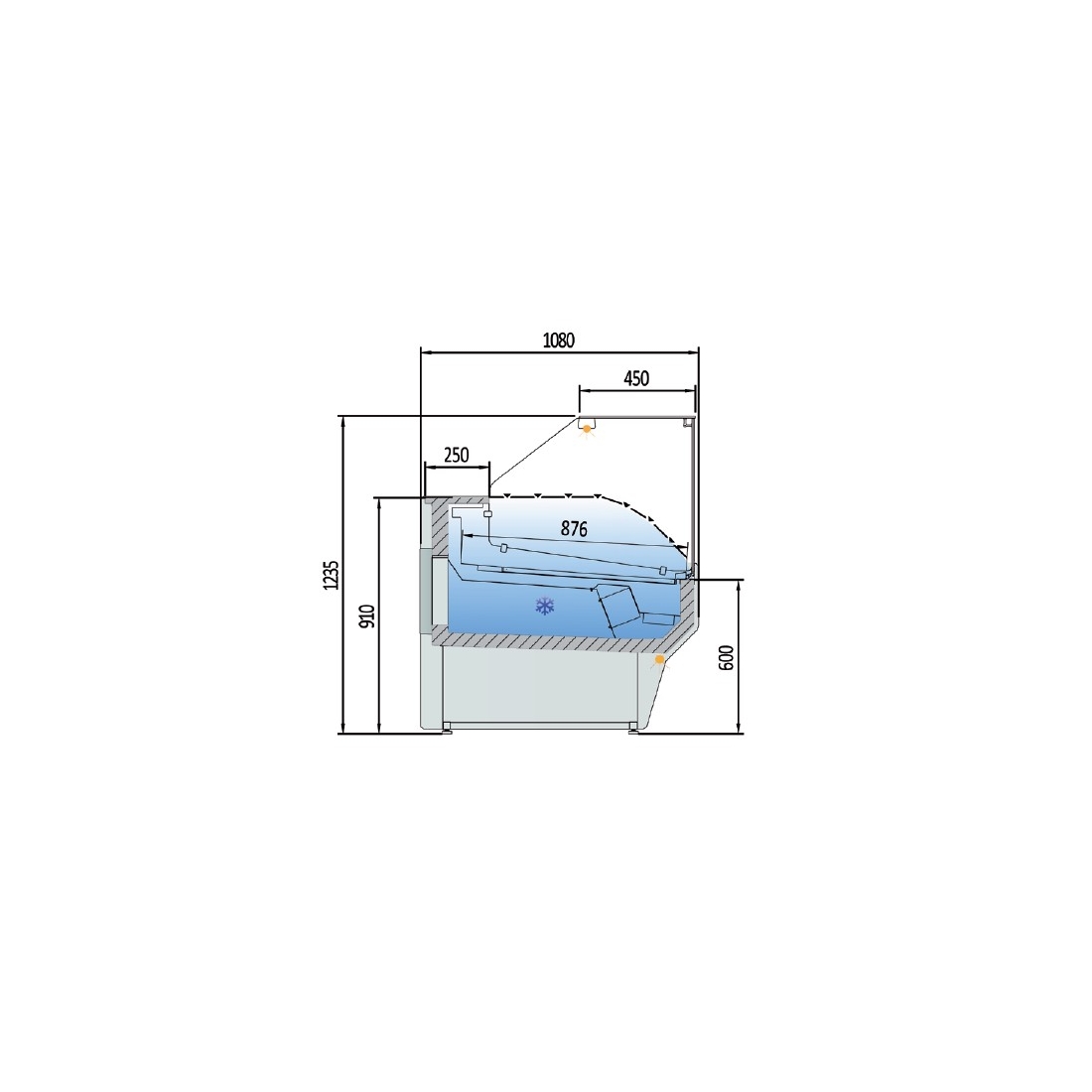 - El aislamiento de la vitrina se logra mediante la inyección de poliuretano con una densidad de 40 Kg/m³, sin efectos negativos para el medio ambiente. La vitrina cuenta con una reserva refrigerada con puertas y un hueco de 440 x 270 mm.