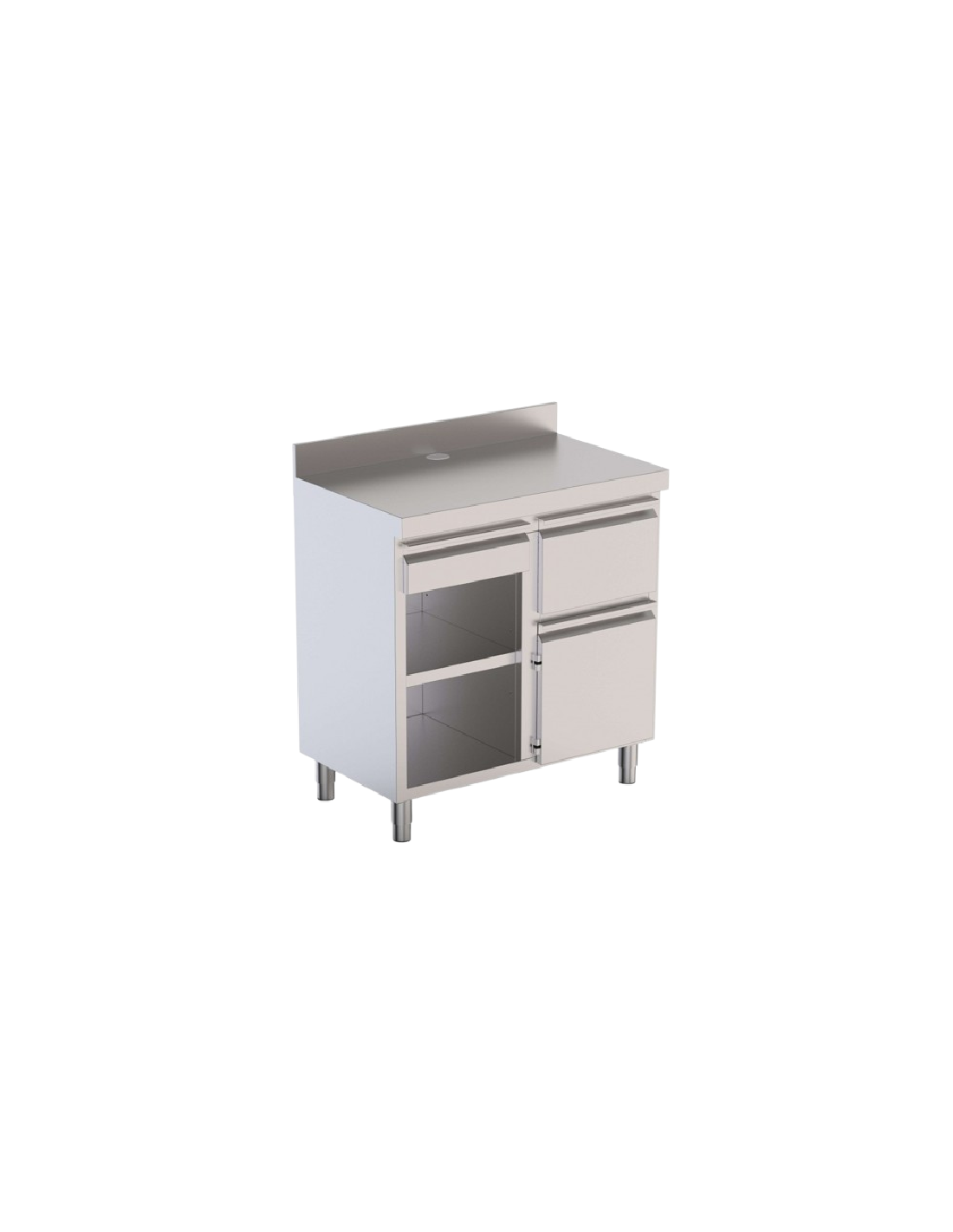 Mueble cafetero de 1 metro fabricado en en acero inoxidable AISI 304 con tolva a la derecha, 1 estante, 1 cajón y 1 puerta. Medidas: 1000 × 600 × 1050 mm. Ideal para colocar en espacios de cafetería, pastelería, bares y restaurantes.