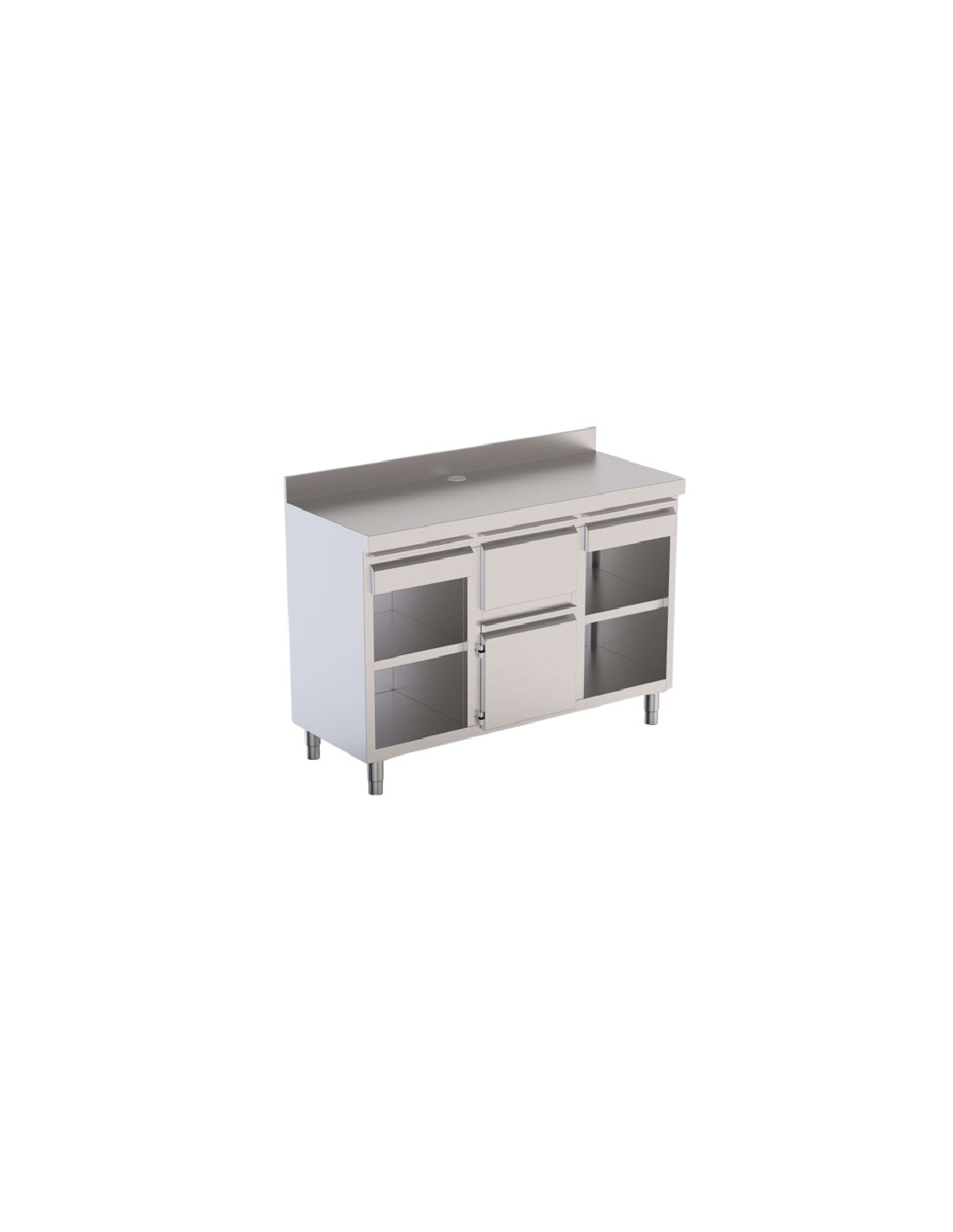 Mueble cafetero mural, con cajón, puerta y estante, construido en acero inoxidable AISI-304, con patas en tubos de 40x40mm regulables en altura 1050-1100mm. Medidas: 1500 x 600 x 1050 mm.