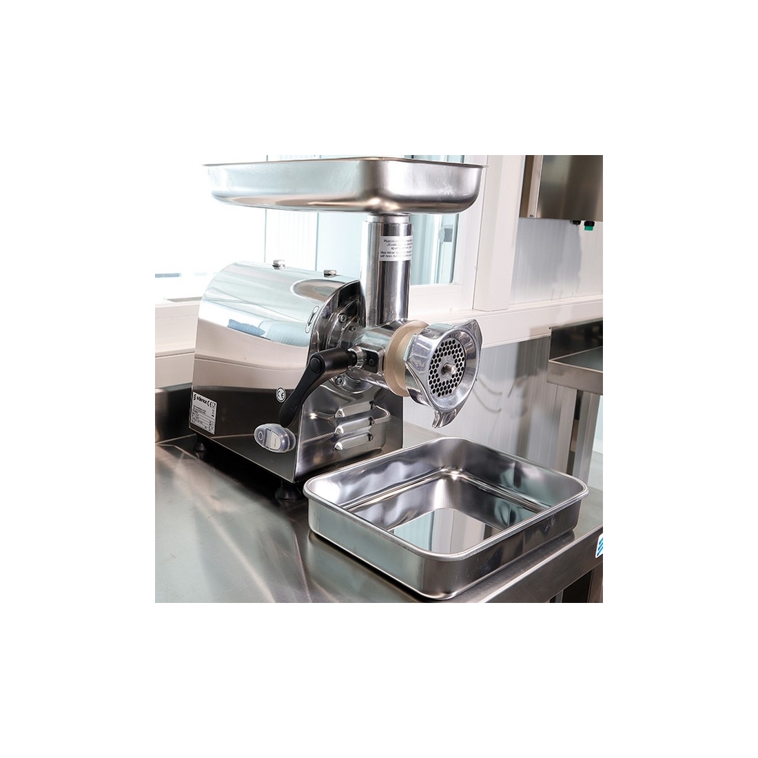 Picadora de carne industrial con boca de 12mm. Tiene una capacidad de producción de hasta 200 Kg/hora y cuenta con una potencia de 750W. Todas las piezas en contacto con el alimento están fabricadas en acero inoxidable.