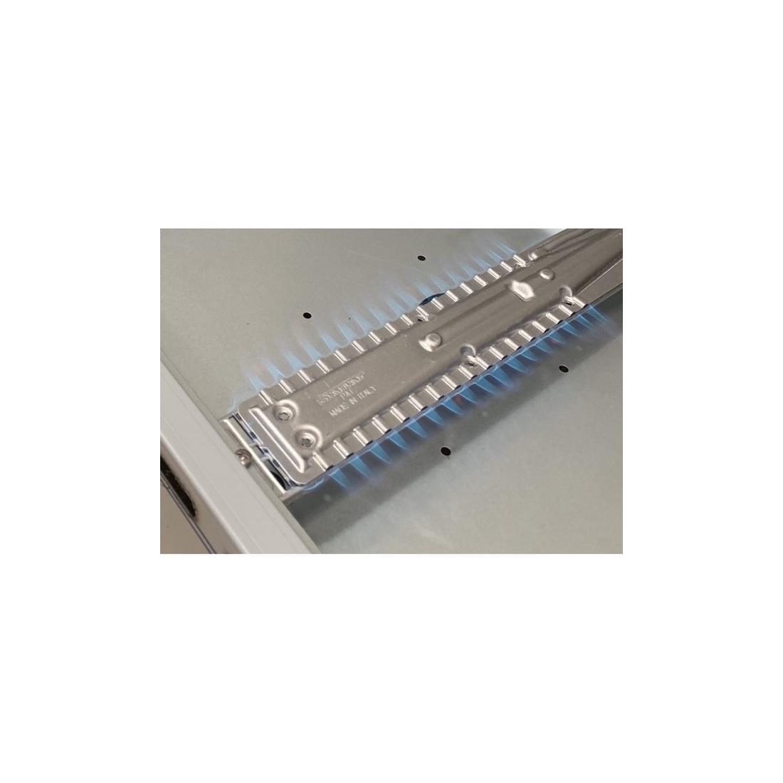 Plancha de asar a gas, con una potencia de 11kw está fabricada en acero laminado con protección anti oxidación con 6mm de espesor y peto trasero de 36mm. Tiene un quemador diseñado por Arilex sin "Zonas Frías" con salida de llama por todo el perímetro de la placa que nos asegura un reparto uniforme de calor.