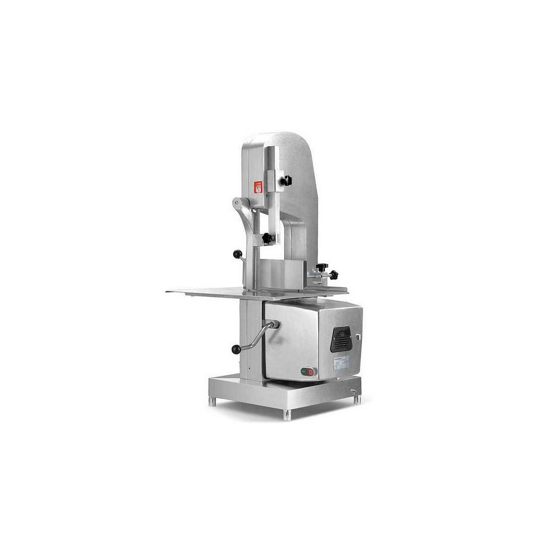 Máquina de sierra para cortar carne y huesos. Capaz de cortar hasta 215 mm de altura y 170 mm de grosor. Potente motor de 750 W en versión monofásica. Velocidad de corte de 15 m/seg para aplicaciones eficientes. Medidas: 400 x 425 x 835 mm. Compacta y versátil.