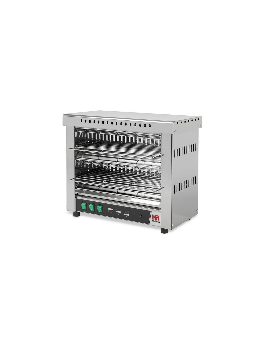 Tostador industrial doble con resistencias en tubo de cuarzo protegidas por parrillas. Es un modelo potente con una potencia de 3600W de fabricación Española. Cuenta con cajón recogemigas.
