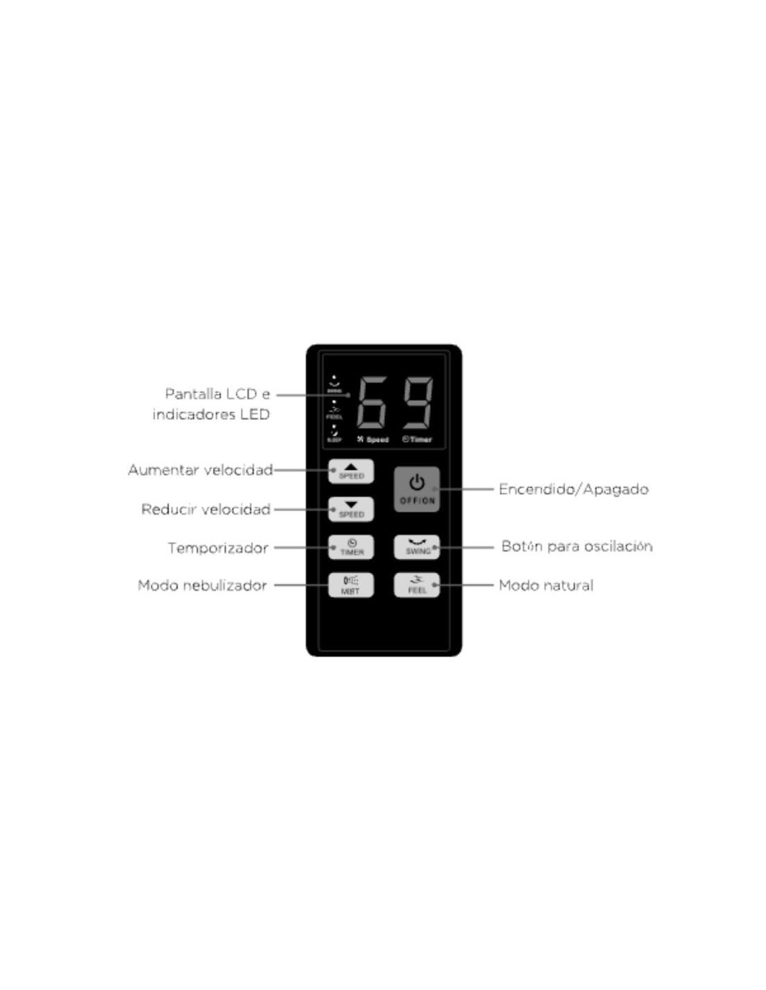 Funciones de oscilación automática, modo natural, pantalla LCD y control de nebulización