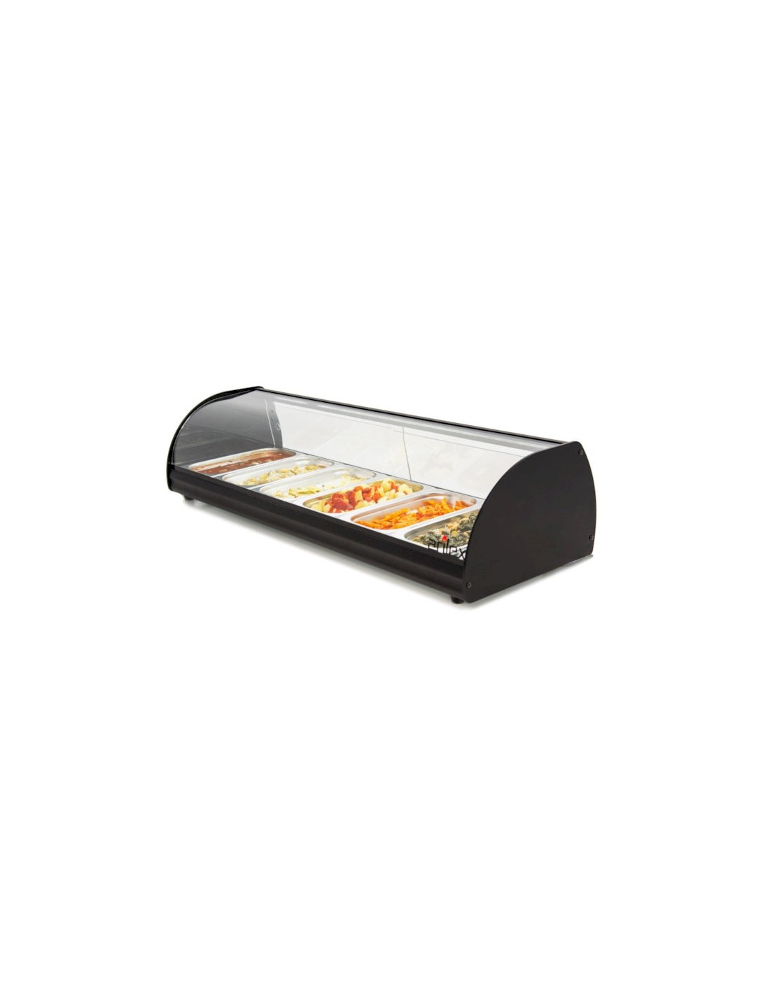 Vitrina calienta tapas con capacidad para 6 bandejas GN 1/3, fabricada en acero inoxidable y cristal templado. Termostato regulable hasta 90 °C y resistencias de acero para calor uniforme. Ideal para exponer y mantener tapas calientes en mostrador profesional. Medidas: 97 × 33 × 32 cm.