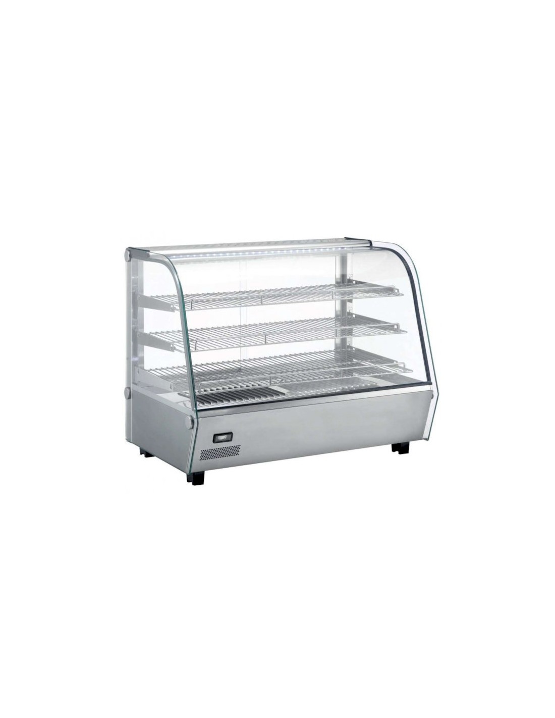 Vitrina caliente sobremostrador con capacidad útil de 160 L, temperatura regulable entre 30 y 90 °C, ventilación interna para distribución homogénea y depósito de agua para atmósfera húmeda. Cuerpo fabricado en acero inoxidable con cristal frontal curvado.