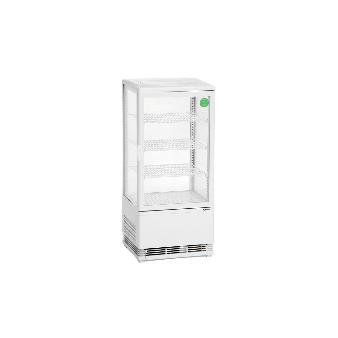 Vitrina de Frio Pequeña 700578G de Bartscher, gracias a su diseño de cuatro caras de cristal, esta exhibidora ofrece una visibilidad perfecta de tus productos, aumentando así las compras por impulso. Ideal para la exposición tanto de bebidas, como de pasteles, comida envasada, etc.