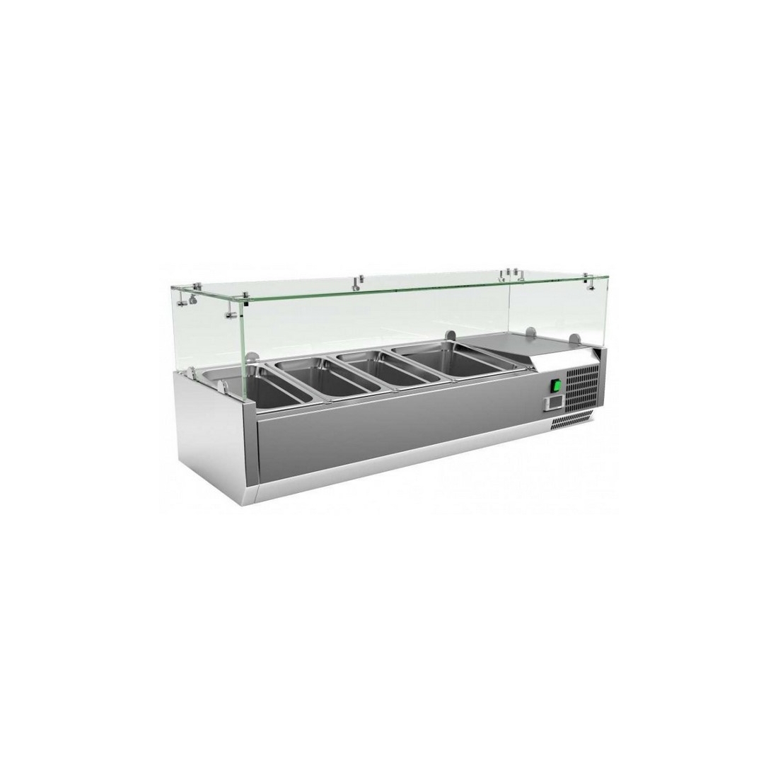 Expositor de ingredientes para colocar sobre mesa refrigerada, cuenta con capacidad de 5 cubetas 1/4. Mide 120cm de largo. Cuenta con cúpula de cristal.