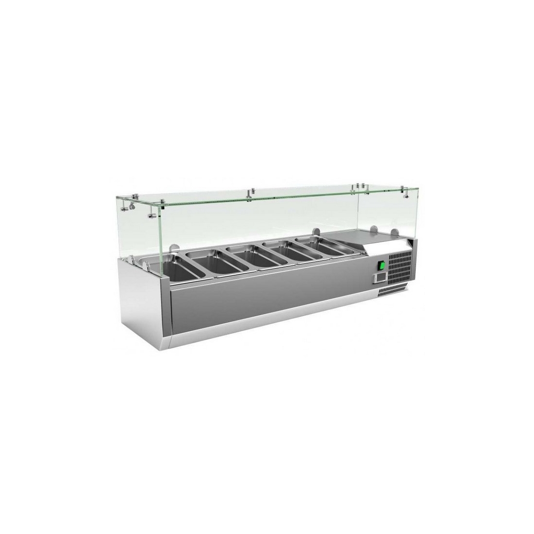 Expositor de ingredientes para colocar sobre mesa refrigerada, cuenta con capacidad de 7 cubetas 1/4. Mide 150cm de largo. Cuenta con cúpula de cristal.