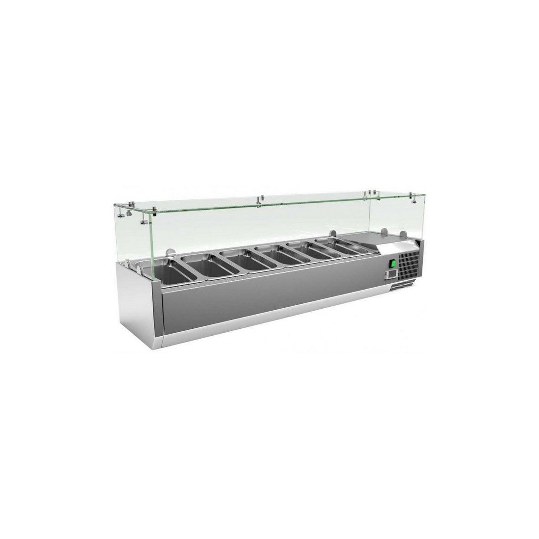 Expositor de ingredientes para colocar sobre mesa refrigerada, cuenta con capacidad de 7 cubetas 1/4. Mide 150cm de largo. Cuenta con cúpula de cristal.