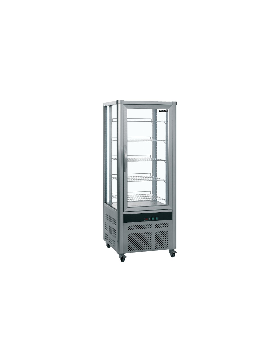 Vitrina pastelera vertical con 4 caras de cristal doble, puerta sin marco y 5 estantes de vidrio. Capacidad 248 L, rango +2 °C a +8 °C y potencia 320 W. Refrigeración ventilada con control electrónico y LED interior. Medidas: 650×650×1950 mm. Clase C.