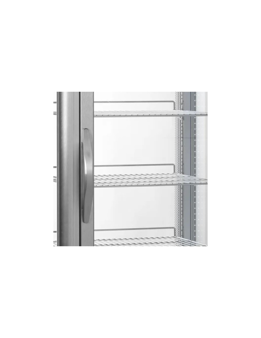 Vitrina pastelera vertical con 4 caras de cristal doble, puerta sin marco y 5 estantes de vidrio. Capacidad 248 L, rango +2 °C a +8 °C y potencia 320 W. Refrigeración ventilada con control electrónico y LED interior. Medidas: 650×650×1950 mm. Clase C.
