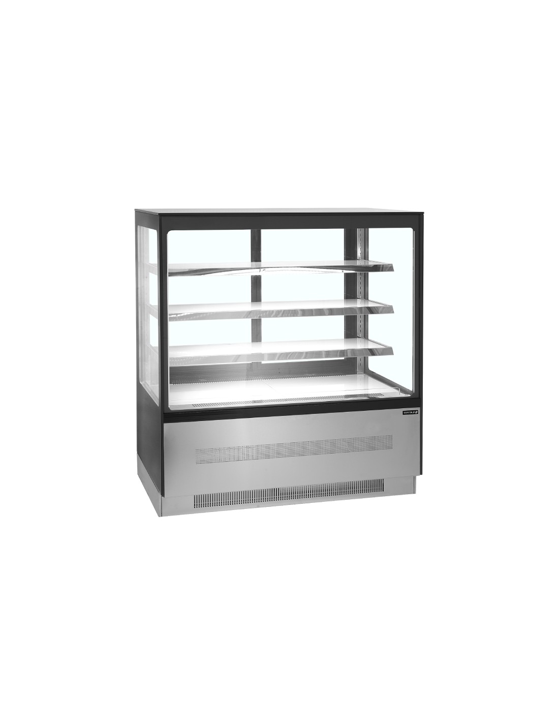 Vitrina pastelera ventilada de 120 cm con 3 estantes de cristal y base de exposición, capacidad 258 L y temperatura +2 °C a +8 °C. Doble acristalamiento, cristal frontal antiempañamiento, iluminación LED y potencia 530 W. Medidas: 1205×745×1350 mm. Clase D.