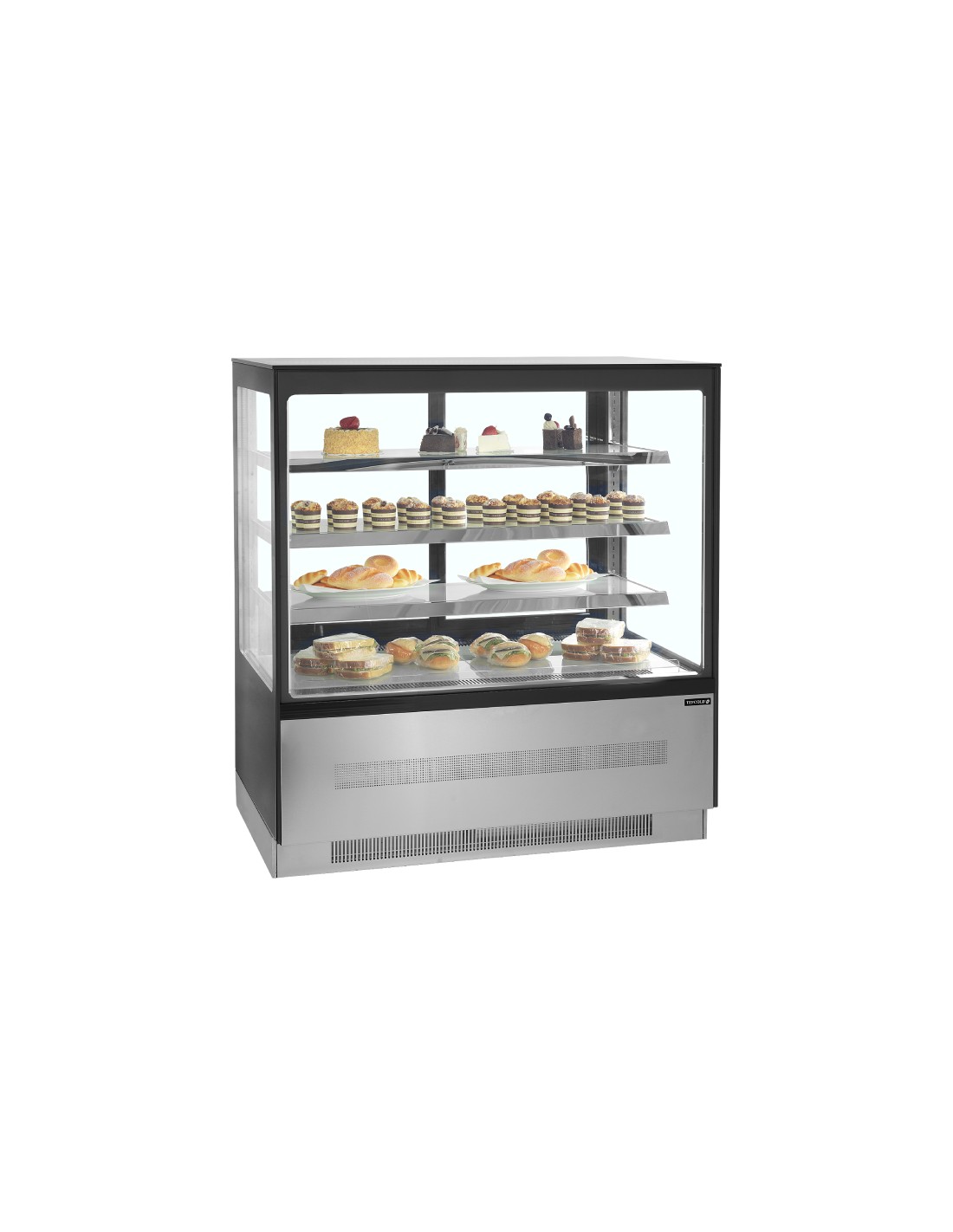 Vitrina refrigerada para pasteles con cristal recto y dos estantes. Modelo de refrigeración ventilada con 400 litros de capacidad. Sus dimensiones son: 1200 x 730 x 1200mm y cuenta con descongelación automática.