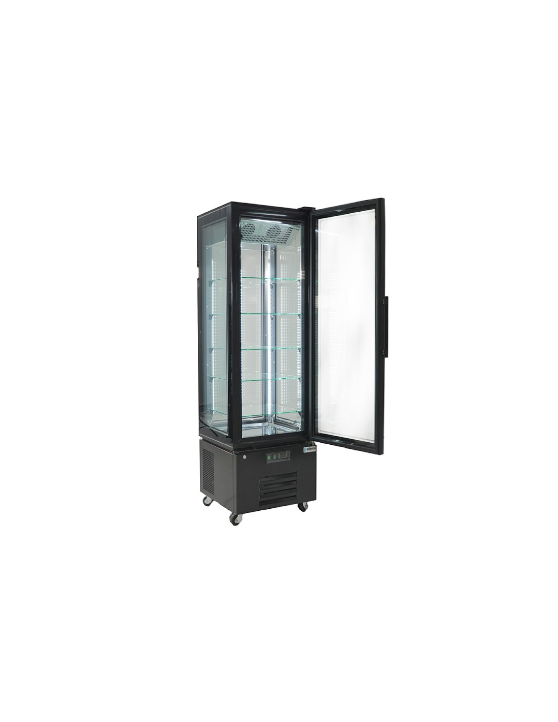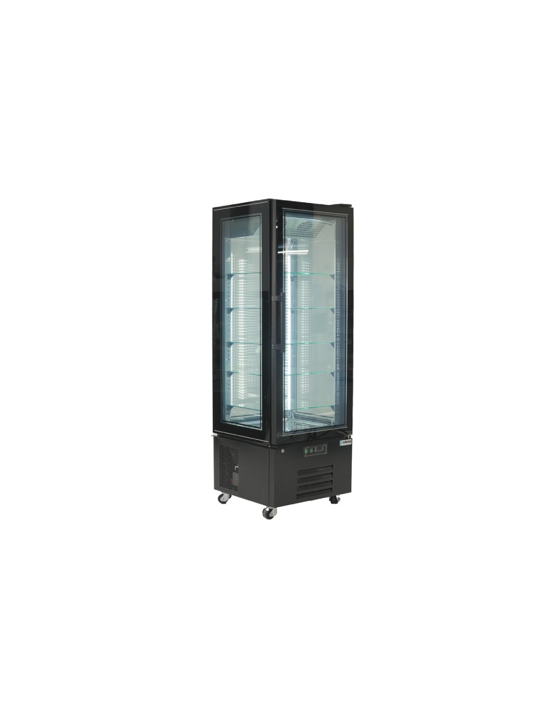 Vitrina de congelación 4 caras de cristal con 319 litros de capacidad y temperatura de -18 a -22 °C. Refrigeración ventilada con desescarche automático, 5 estantes regulables e iluminación LED. Potencia 1000 W. Medidas: 65 × 65 × 195 cm. Ideal para pastelería y heladería.