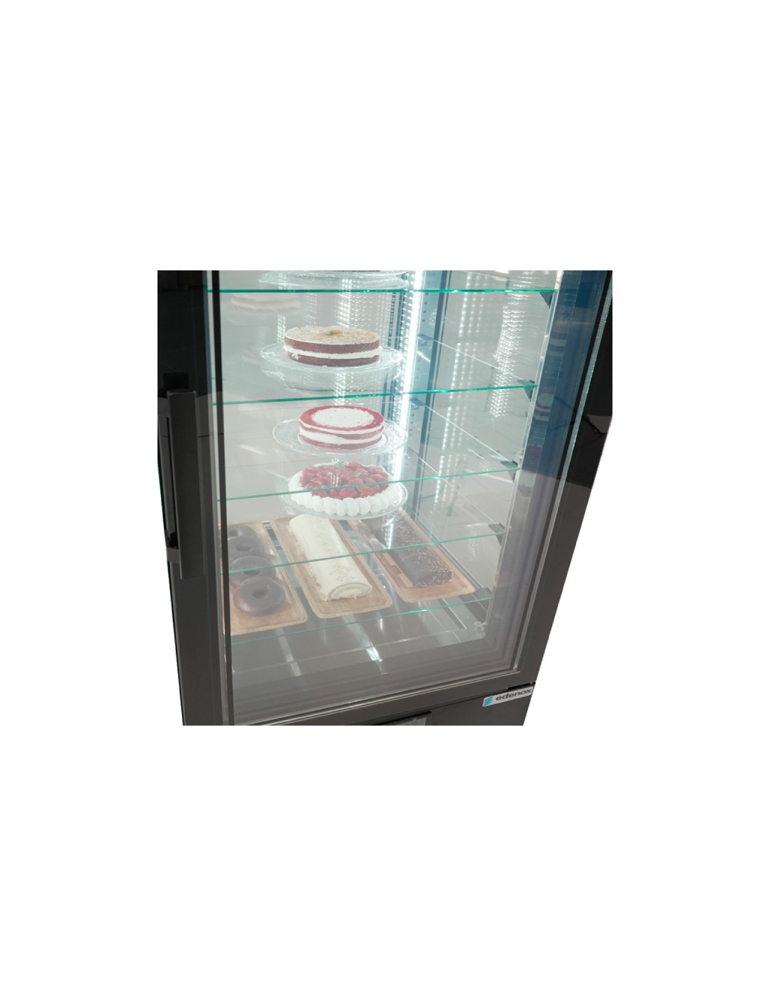 Está destinado a pastelerías, cafeterías y negocios de restauración que buscan exponer productos refrigerados con alta visibilidad y presentación cuidada.