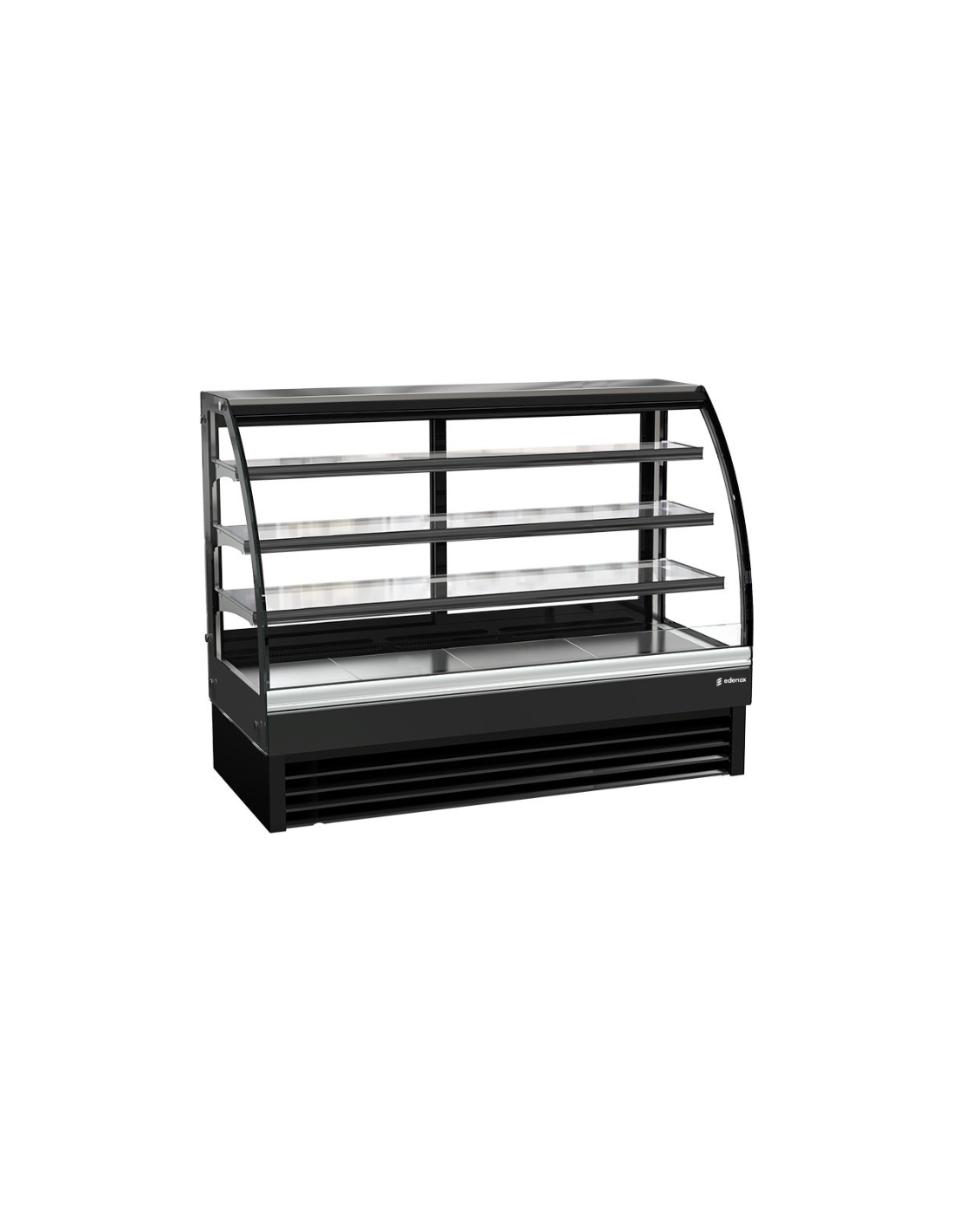 Vitrina pastelera con cristal curvo, capacidad de exposición regulable y temperatura de trabajo de 2 °C a 8 °C. Refrigeración ventilada, desescarche automático y control digital. Potencia de 525 W, estructura en acero inoxidable y ruedas con freno. Medidas: 925 × 702 × 1420 mm. Tensión: 230 V