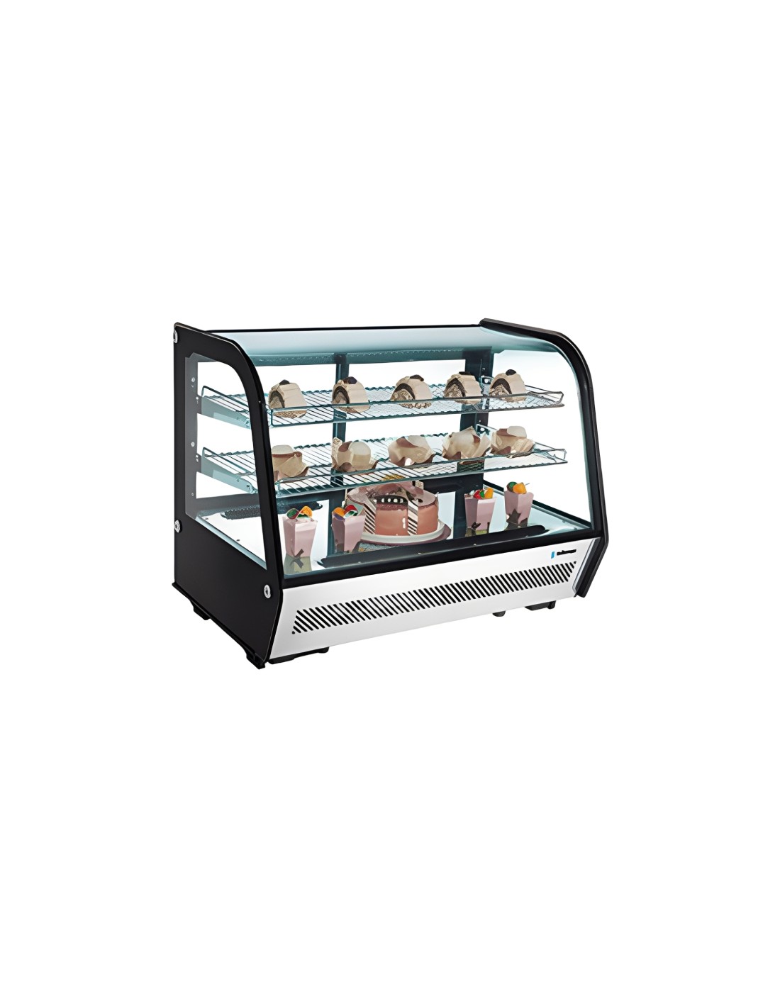 Vitrina expositora refrigerada de sobre mostrador. Modelo de refrigeración ventilada con 120 litros de capacidad. Sus dimensiones son: 700 x 575 x 676mm y cuenta con descongelación automática. Ideal para pasteles.