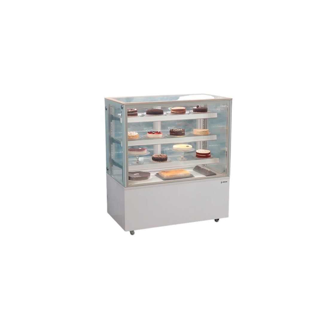 Vitrina refrigerada para pasteles con cristal recto y dos estantes. Modelo de refrigeración ventilada con 400 litros de capacidad. Sus dimensiones son: 1200 x 730 x 1200mm y cuenta con descongelación automática.