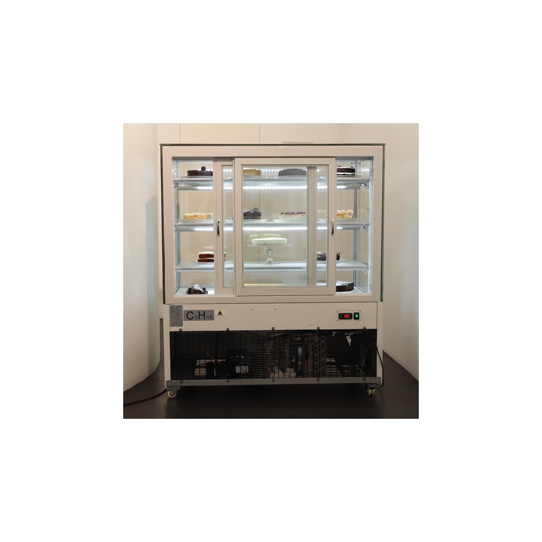 Vitrina Expositora refrigerada ideal para pastelerías. Modelo de 120cm, cuenta con refrigeración ventilada, puertas traseras correderas y rango de temperatura +2/+8ºC. Modelo de suelo con estética curva blanca.