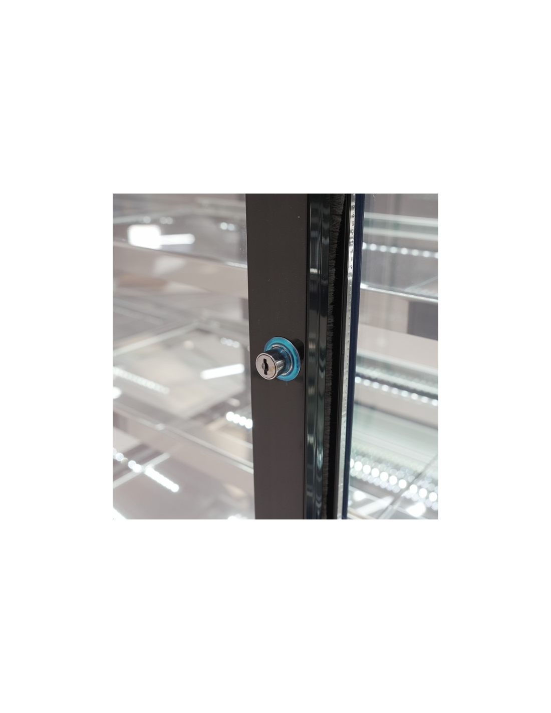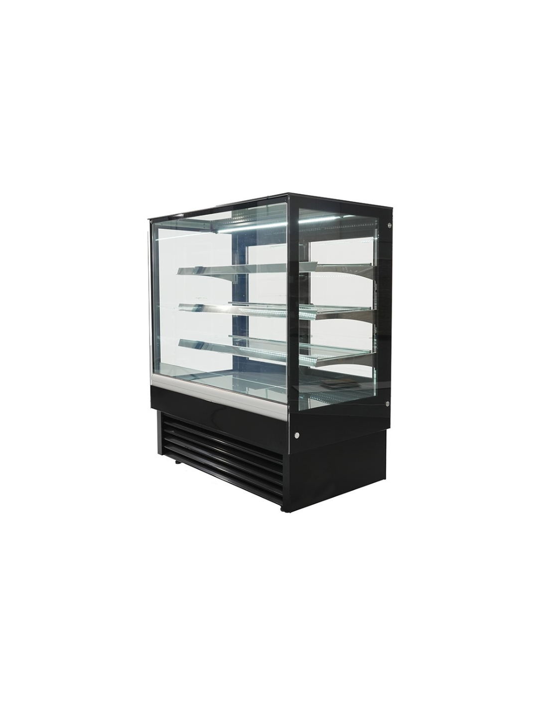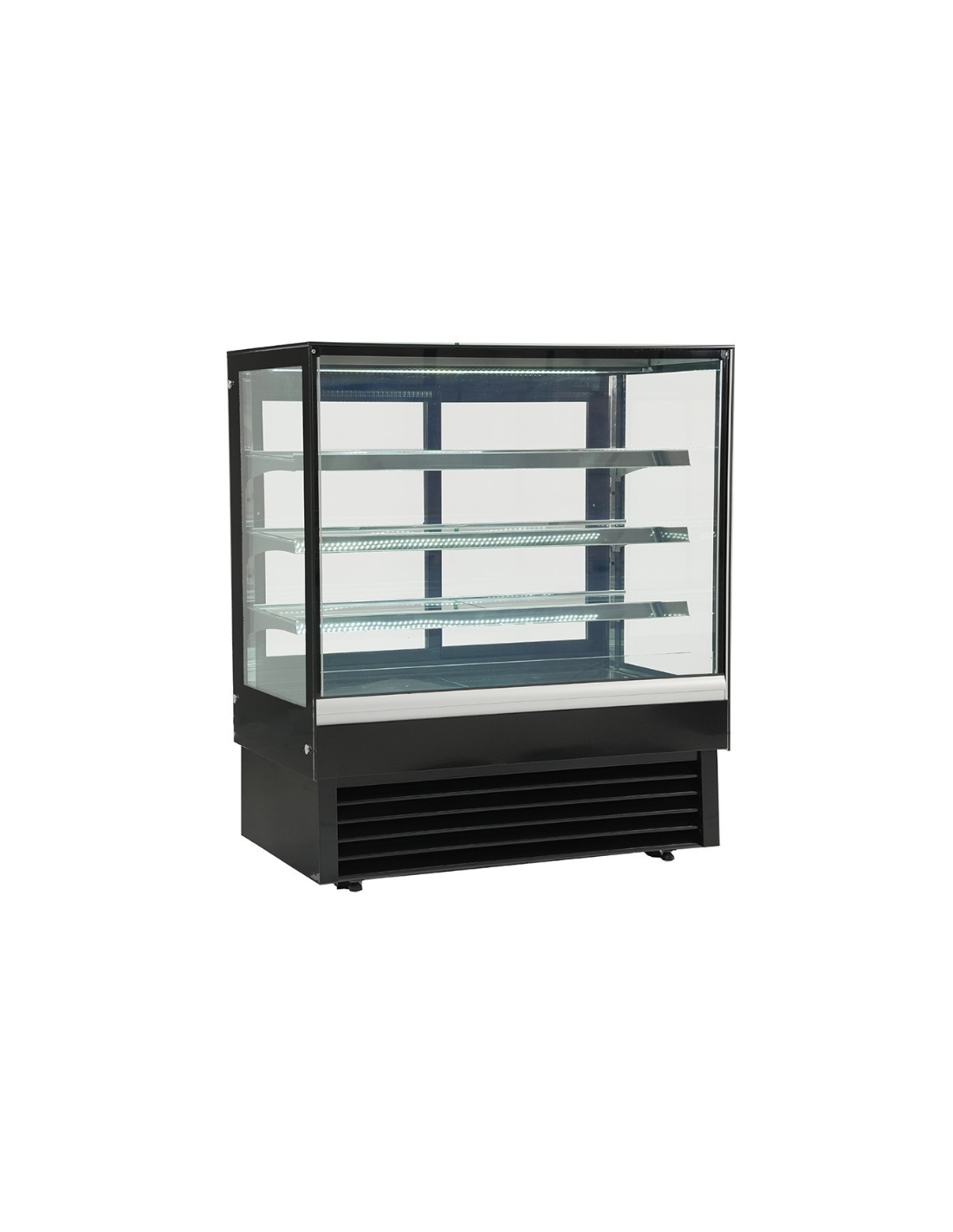 Vitrina Pastelera de diseño moderno con una amplia superficie de exposición, reserva refrigerada con 1 puerta, 2 estantes y doble evaporador estático. Destaca por su eficiencia energética, trabajando en un rango de temperatura de 0º-8ºC . Clase Climática 4. Medidas: 1000x973x1299h mm. De serie viene en color negro.
