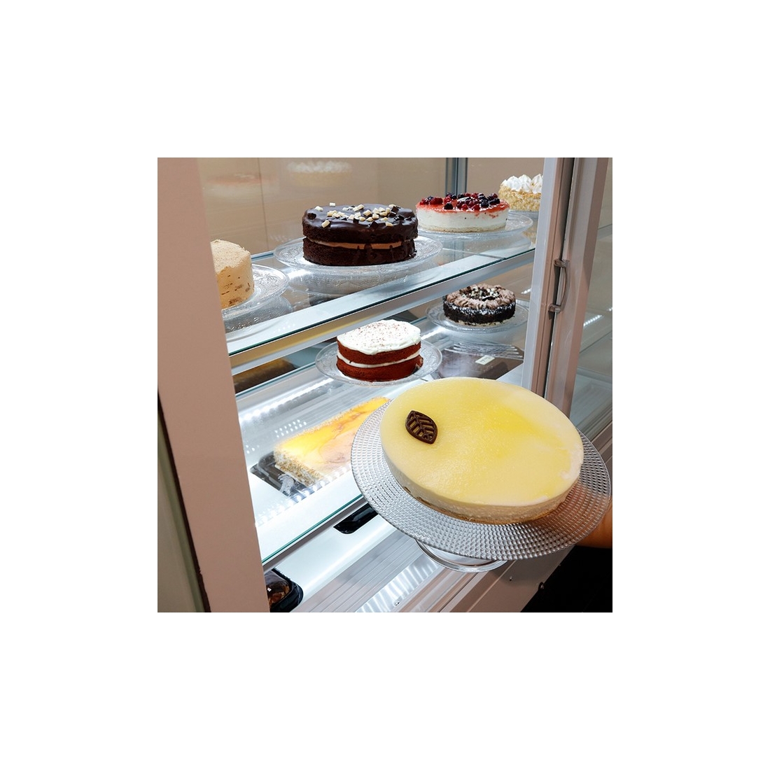 Vitrina Pastelera de diseño moderno con una amplia superficie de exposición, reserva refrigerada con 1 puerta, 2 estantes y doble evaporador estático. Destaca por su eficiencia energética, trabajando en un rango de temperatura de 0º-8ºC . Clase Climática 4. Medidas: 1000x973x1299h mm. De serie viene en color negro.