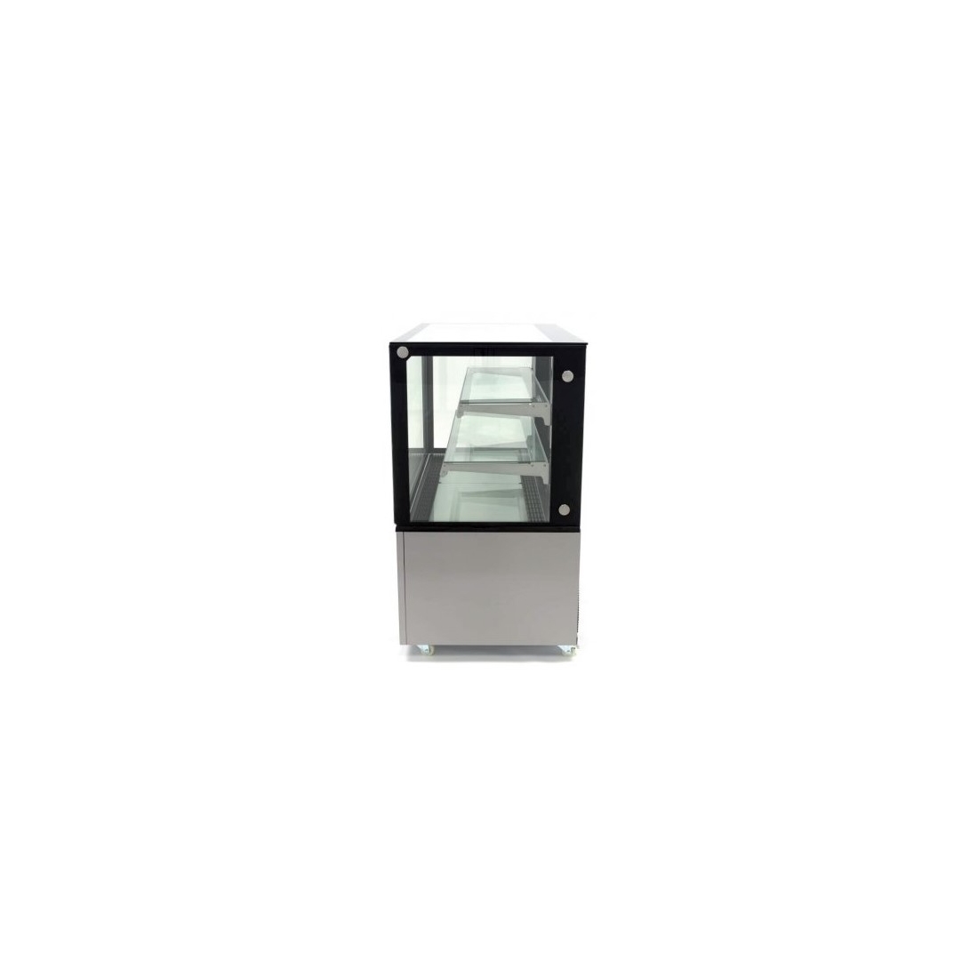 Vitrina Expositora refrigerada ideal para pastelerías. Modelo de 90cm, cuenta con refrigeración ventilada, puertas traseras correderas y rango de temperatura +2/+8ºC. Modelo de suelo con estética recta blanca.