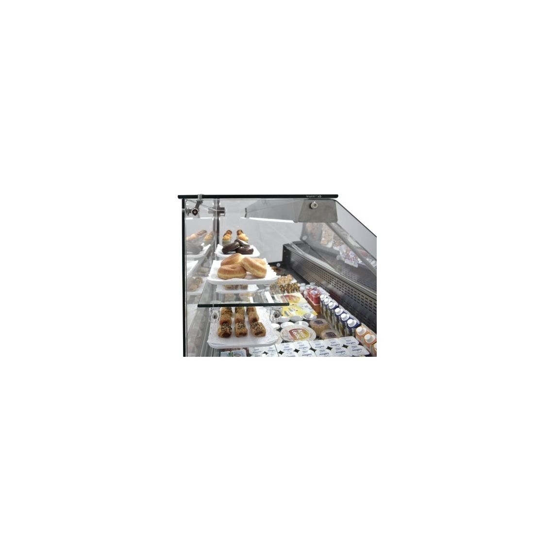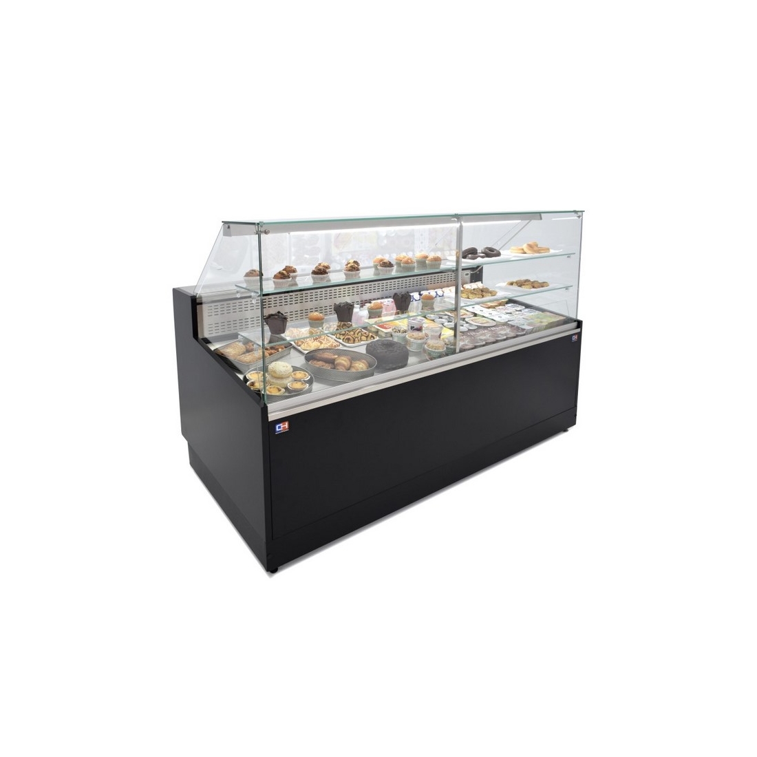 Elegante vitrina de pastelería de 1,5 metros. Cuenta con un plano de exposición en acero inox de 640 mm de profundidad. Incluye de serie 2 estantes, 2 puertas traseras para la reserva, termostato digital con desescarches automáticos optimizados y evaporación automática. Sistema de refrigeración estático. Diseño de cristal recto.
